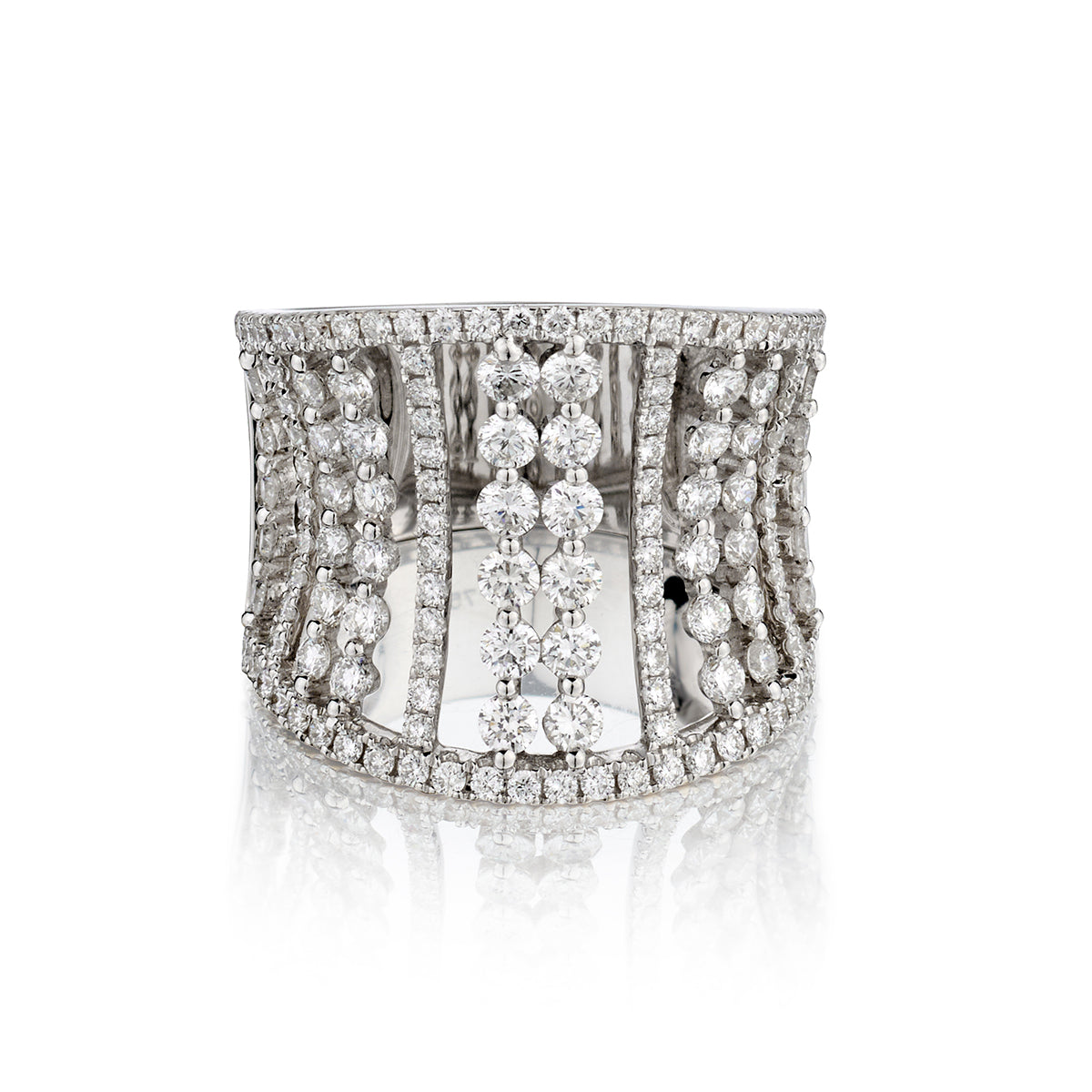 18kt white gold diamond ring. This ring is set with 2.00 total carat weight of brilliant cut diamonds of (VS) in clarity and (G) in colour. Concave design. Measuring: 18mm. Current finger size: 7. This ring can be resized.