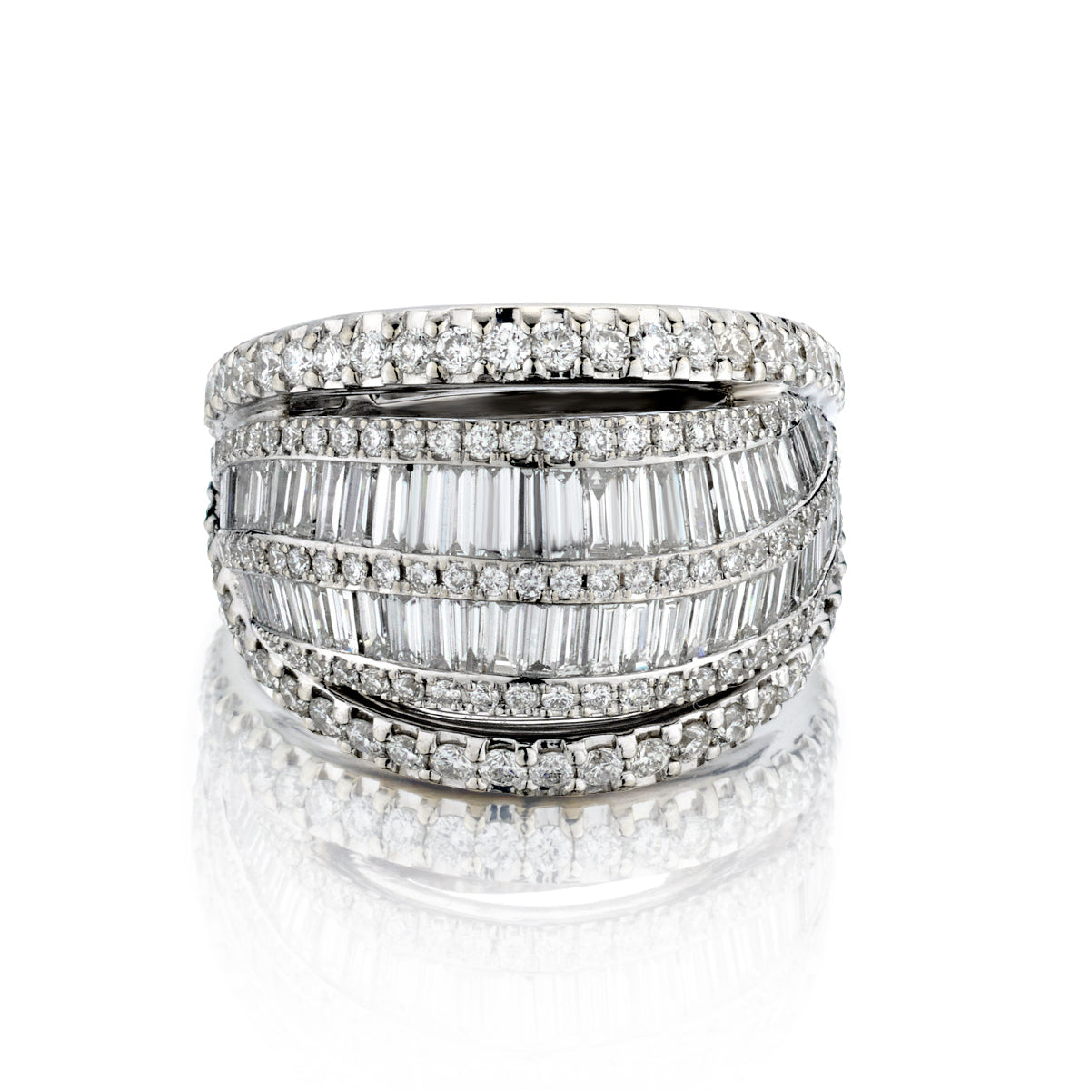 18kt white gold diamond dome ring featuring 3.00 total carat weight of Brilliant and baguette cut diamonds of (VS) in clarity and (G) in colour. Measuring 16.5mm. Current finger size: 6-3/4. This ring can be resized.