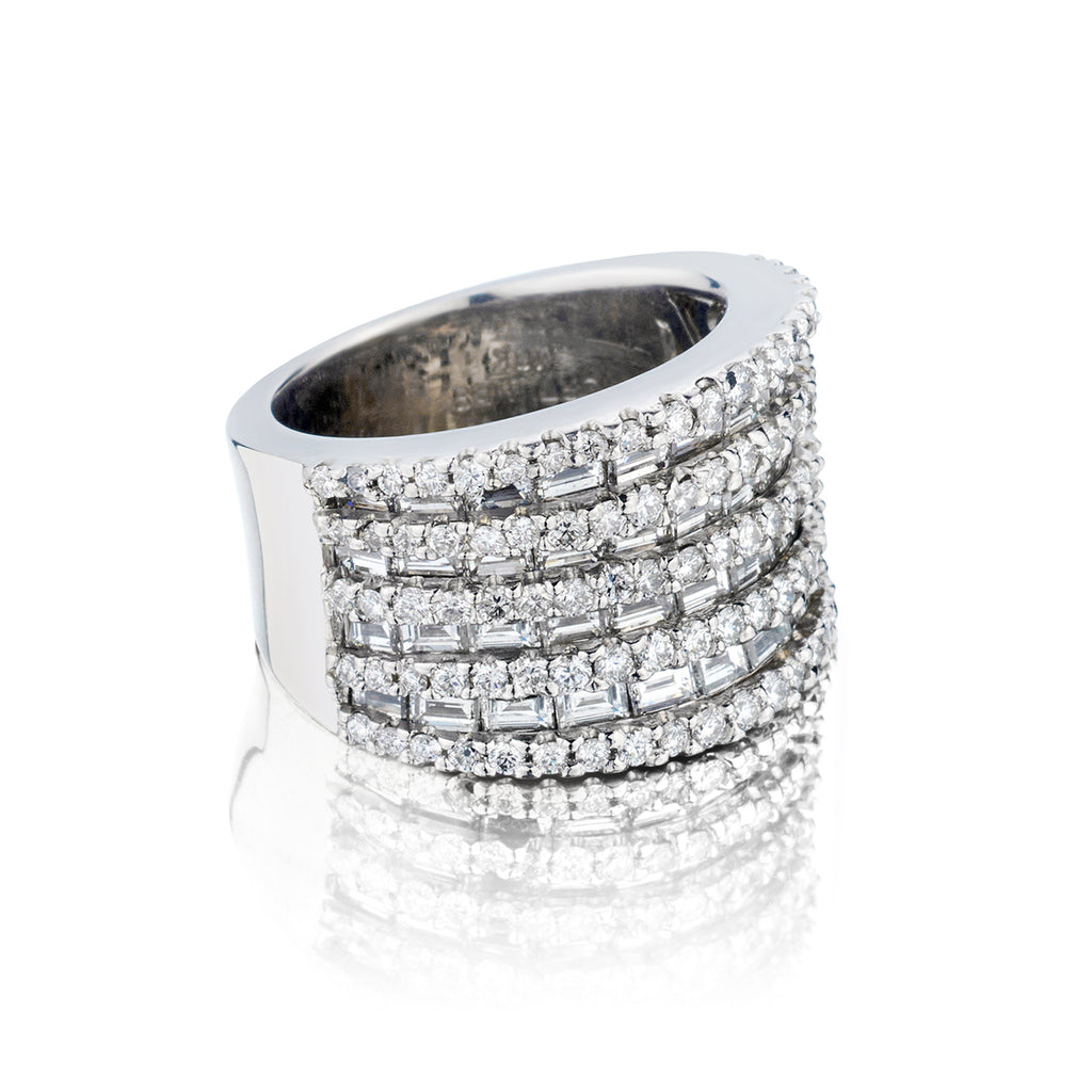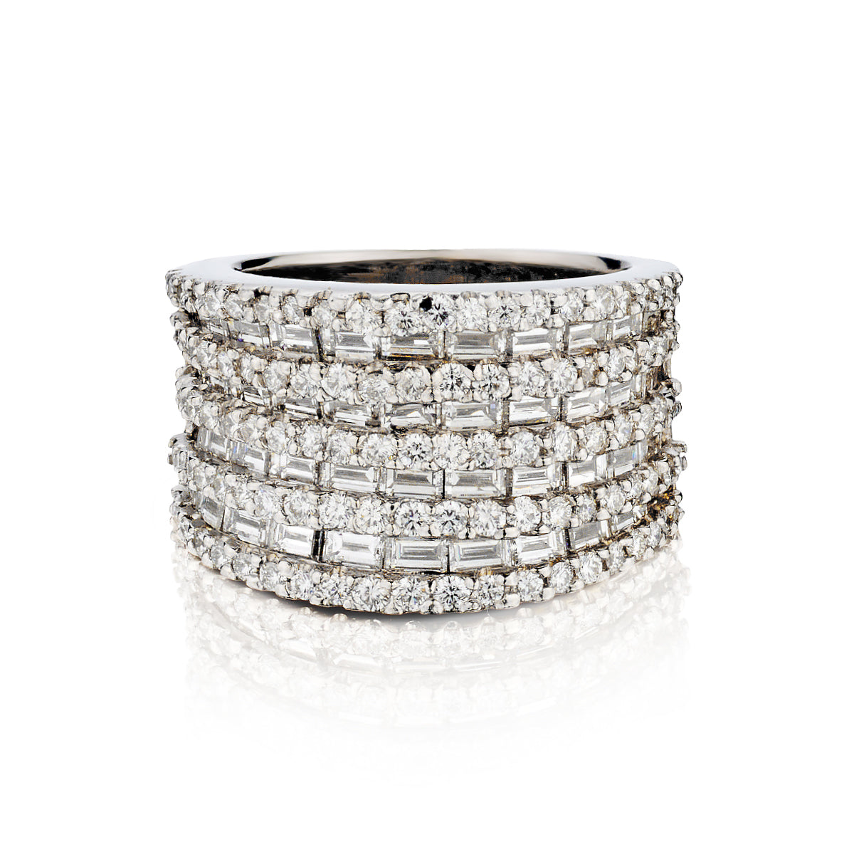 18kt white gold diamond band featuring 4.00 total carat weight of Brilliant and Baguette cut diamonds of (VS-SI) in clarity and (G-H) in colour. This band is set with 5 rows of Brilliant cut diamonds and 4 rows of intermittent baguette cut diamonds. Measuring: 14mm (W). Current finger size: 5-3/4. This ring can be resized.