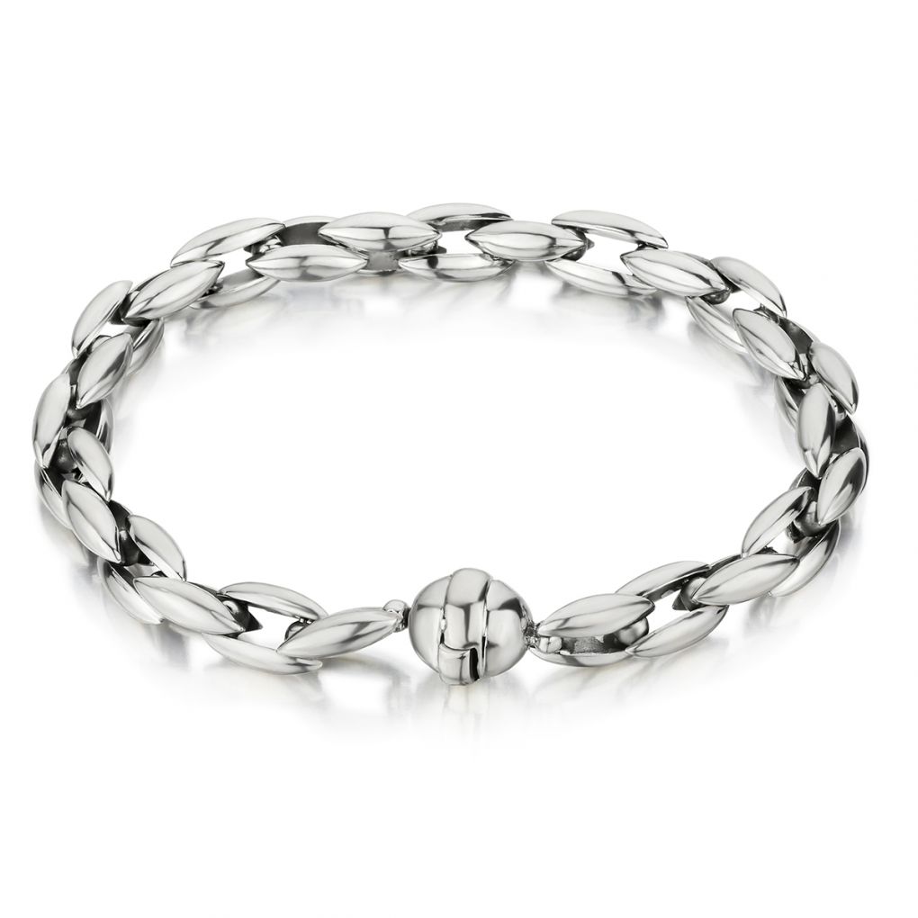 Ladies 14kt white gold high-polished unique link bracelet. 7 1/2" in length. Weighs 18.4 grams in weight.
