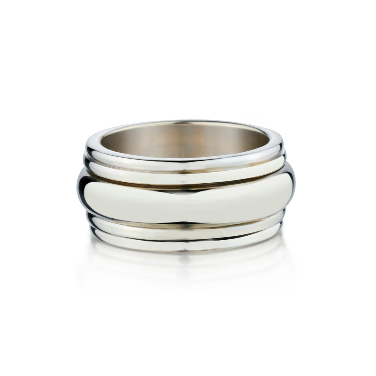Unisex 18kt white gold wide band. Centre band revolves in ring. Weight: 19 grams. Measuring: 10mm (W). Current finger size: 7.5. This ring cannot be resized.