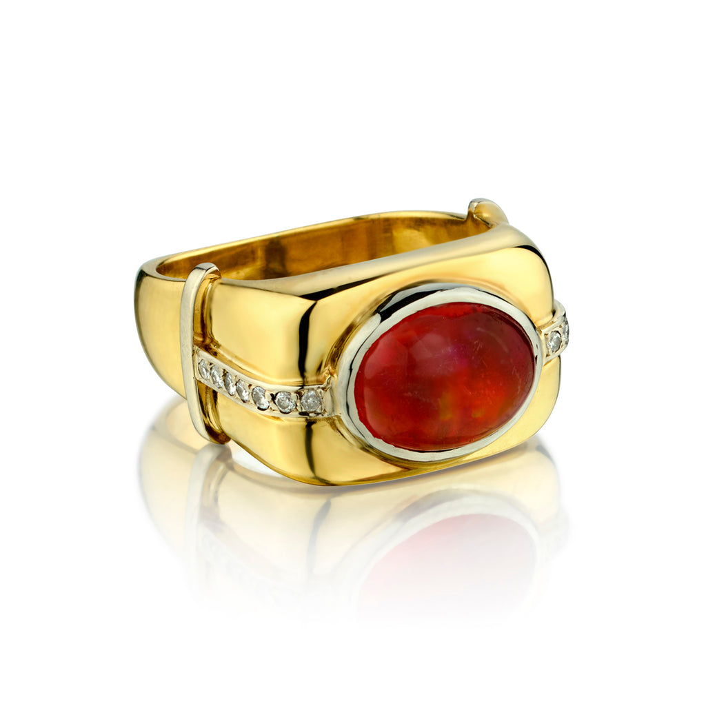 • 18kt Yellow Gold Custom Made Orange Opal and Diamond Ring.
