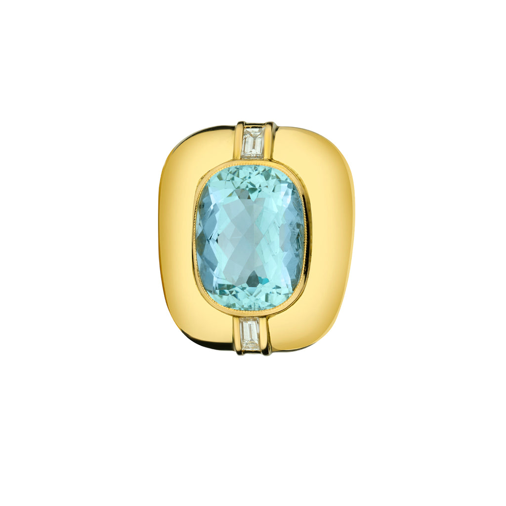 • 18kt Yellow Gold Handmade Brooch. 15.00 Carat Aquamarine
