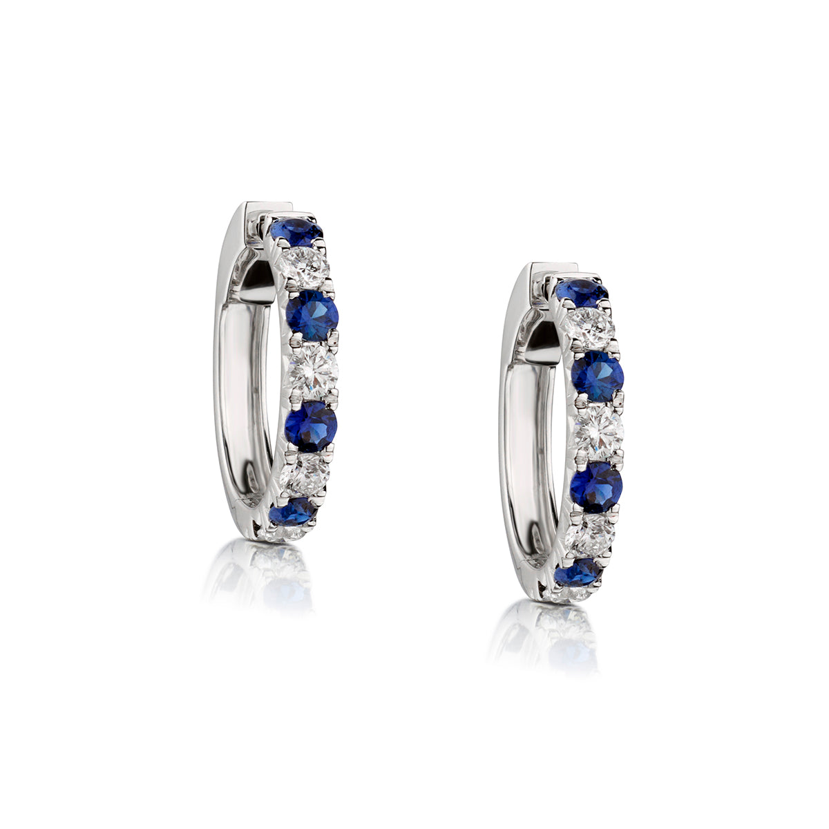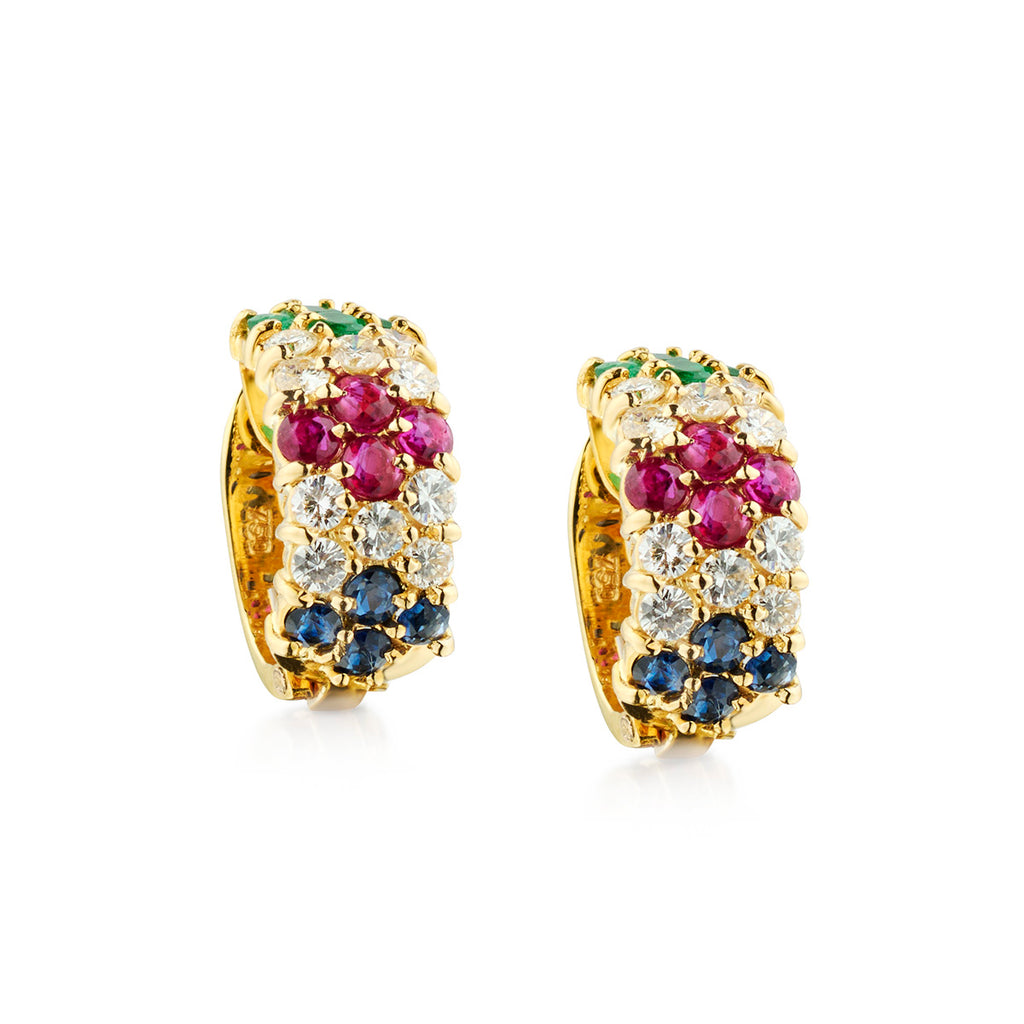 • 18kt Yellow Gold Ruby, Blue Sapphire, Emerald and Diamond Huggies Earings.