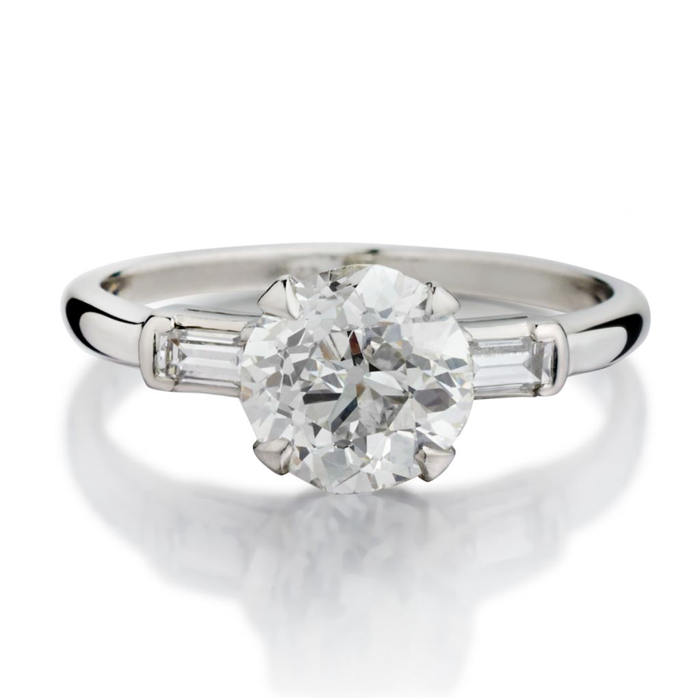 Ladies vintage classic platinum diamond engagement ring featuring a 1.88 carat Old-European cut diamond of (SI-2) in clarity and (M) in color. Further enhanced by 2 x 0.20 carat total weight of baguettes. Currently a finger size 5-1/2 . This ring can be resized.