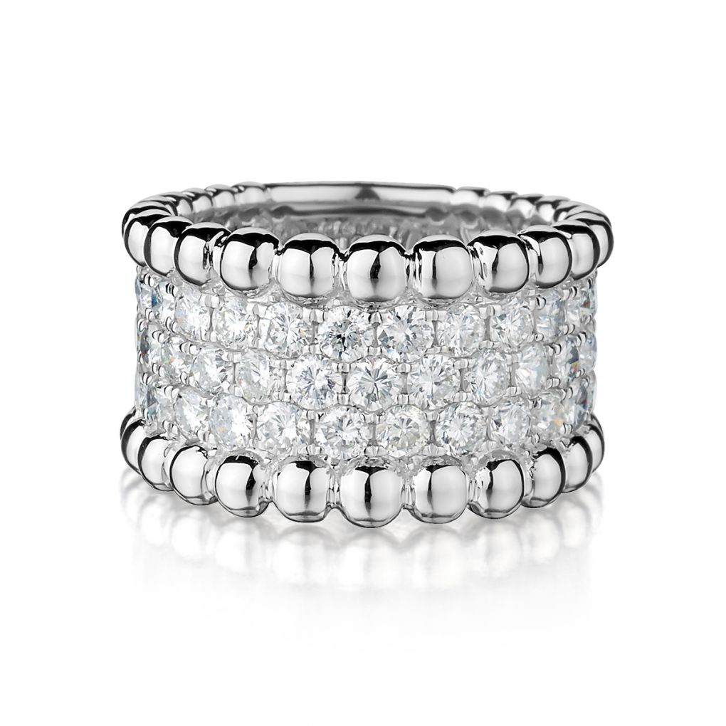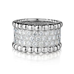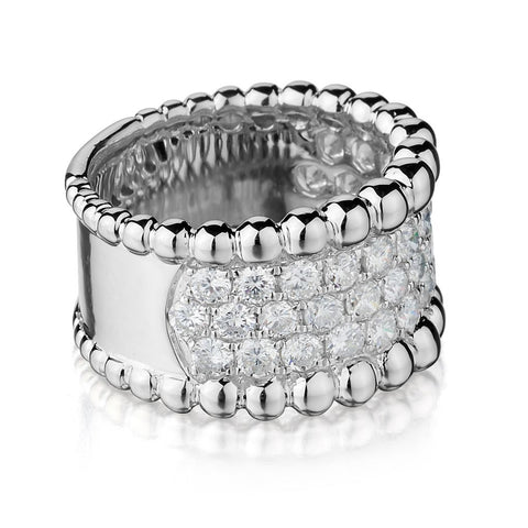 Ladies 18kt white gold diamond band featuring 2.00 carat total weight of pave-set round brilliant cut diamonds of (SI) in clarity and (G) in color. Three rows of diamonds. Currently a finger size 6 1/2 but can be resized. Diamonds going half way. 13mm wide.