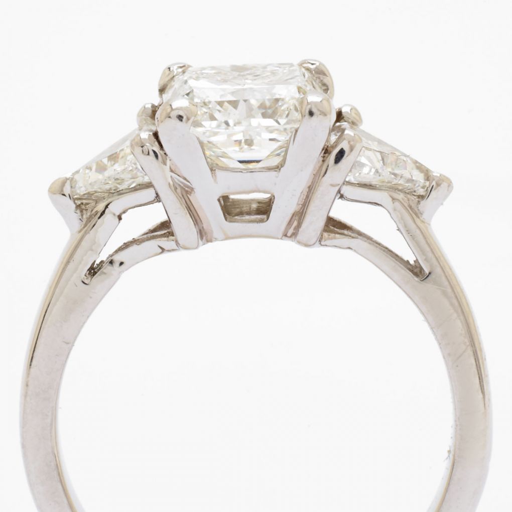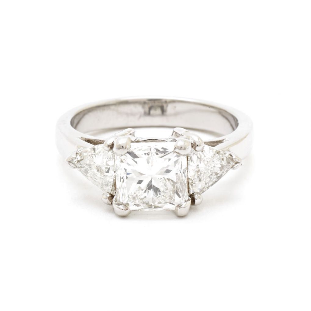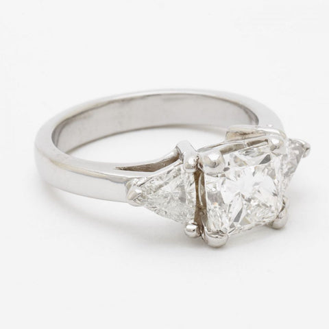 Ladies Platinum ring featuring a 2.05 carat Princess cut diamond of (VVS) in clarity and (F) in color. Also featuring (2) Trillian-cut diamonds weighing approximately 0.60 total carat weight.