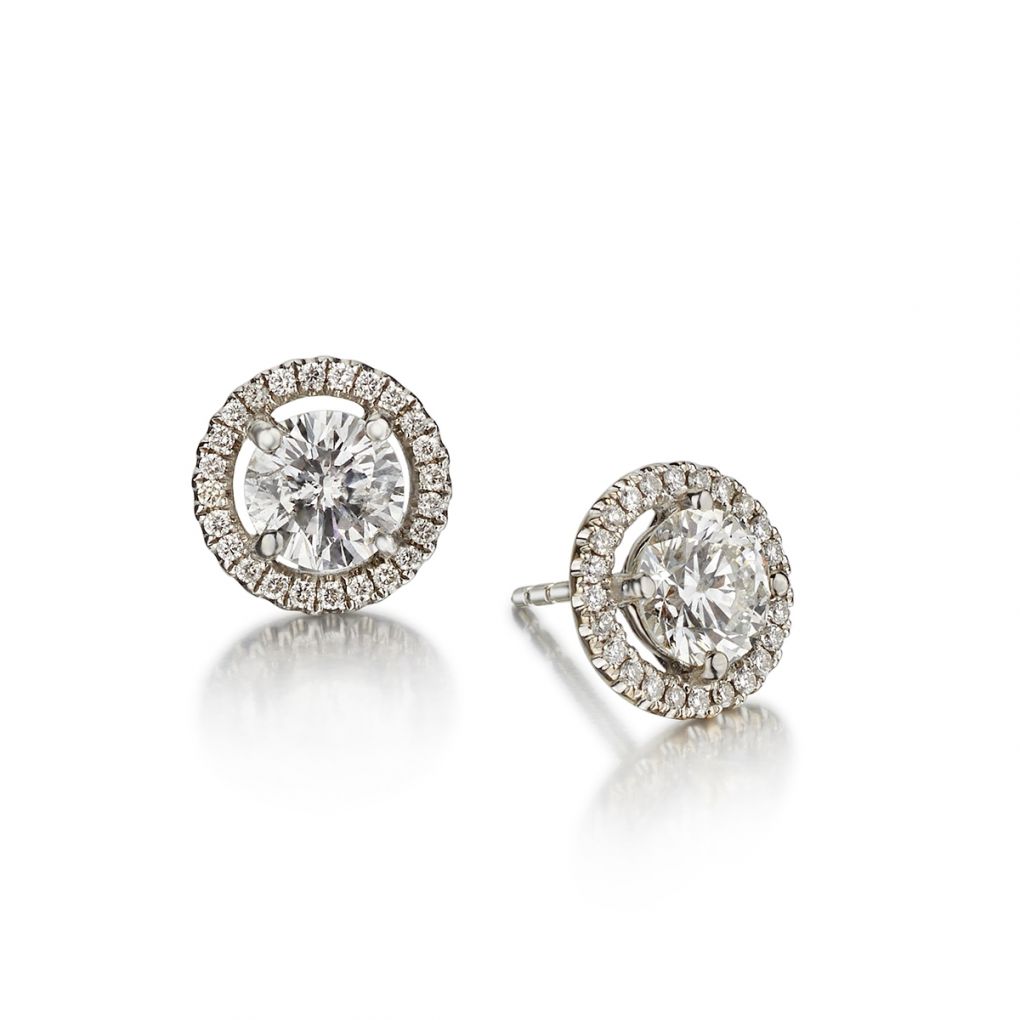 Ladies 18kt white gold diamond stud halo-set earrings featuring (2) Round Brilliant cut diamonds weighing 2.05 carat total weight of (SI2/I1) in clarity and (G-H) in color. The centre stone is surrounded by a halo of 0.50 carat total weight of Round Brilliant cut diamonds. Post and butterfly backing.