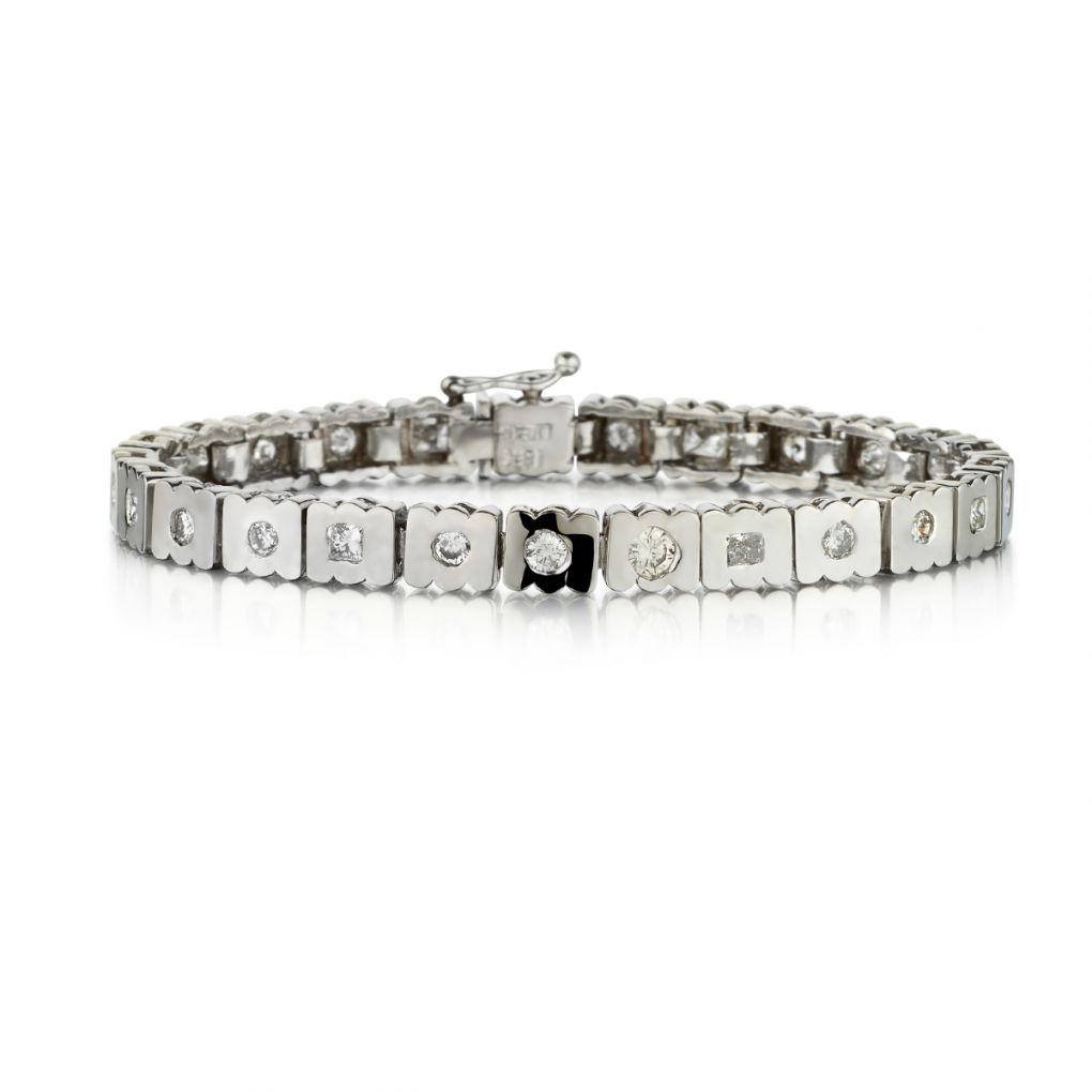 Ladies 18kt white gold diamond bracelet featuring (25) Round Brilliant cut and Princess cut diamonds weighing 3.00 carat total weight of (SI) in clarity and (H-I) in color. 5mm in width. 18.5 grams in weight. 6 1/2" in length.