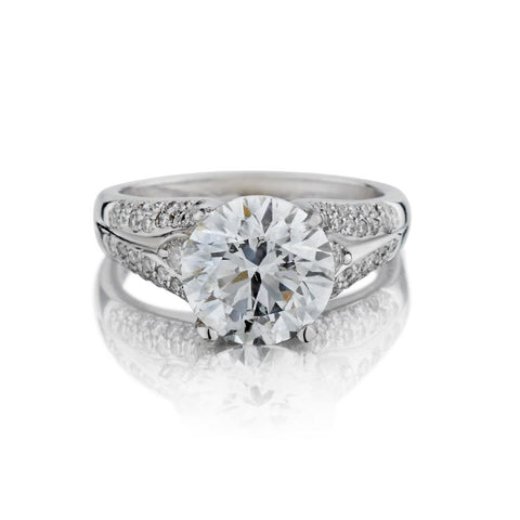 Ladies remarkable 18kt white gold diamond engagement ring featuring a 3.02 carat Round Brilliant cut diamond of (SI-2) in clarity and (G-H) in color; enhanced by 0.46 carat total weight of Round Brilliant cut diamonds along the band. This unique ring displays beautiful craftsmanship and is stamped FSC. Currently a size 5 1/2 but can be resized.