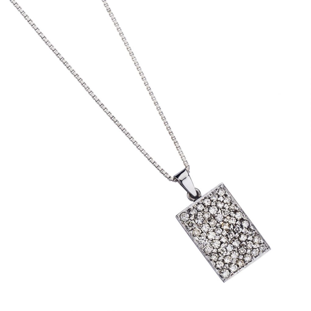 Ladies 14kt white gold diamond dog tag necklace featuring 3.50 carat total weight of Round Brilliant cut diamonds of (SI) in clarity and (I-J) in color. Featured on a 10kt white gold box chain. 17" in length.
