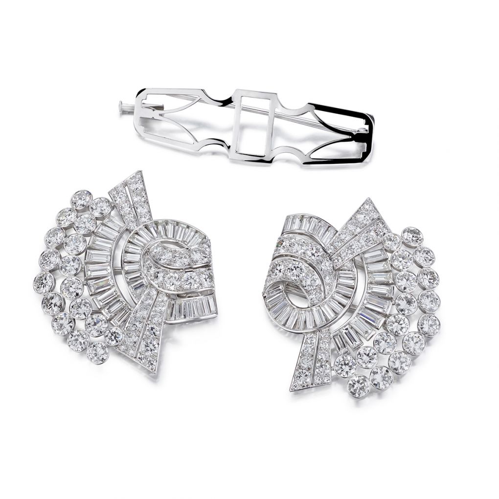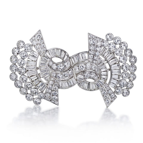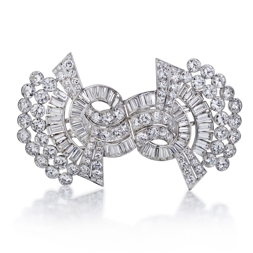 • Art-Deco Platinum and Diamond Fan-Styled Convertible-Design Brooch/Clips