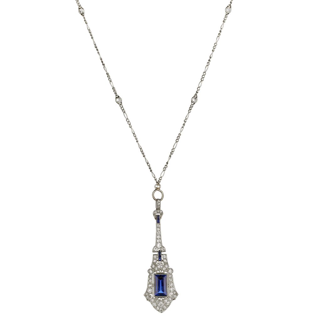 Beautiful Platinum Art Deco vintage Blue sapphire and Diamond pendant. This pendant features a synthetic rectangular sapphire approx. 1.00 carat weight. This pendant also features square cut authentic square Blue Sapphires. Pendant measures 44mm (L) only. Beautiful filigree work. This pendant is attached to a 24" chain set with 14 x single cut diamonds. Circa 1930's.
