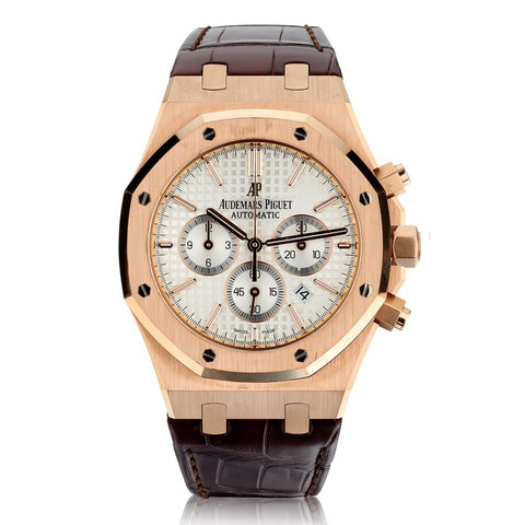 Gent's 18kt rose gold Audemars Piguet Royal Oak Chronograph watch. Fixed 18kt rose gold bezel. Silver Grande Tapisserie pattern dial with luminous hands and hour markers; chronograph sub-dials displaying: 60 second, 30 minute and 12 hour; date display between the 4 and 5 o'clock positions. Automatic movement. 41mm case diameter. Featured on a brown leather strap. Sapphire crystal. 10.8mm case thickness. Solid caseback. Purchased in Dec. 2016. Reference #: 26320OR.OO.D088CR.01.