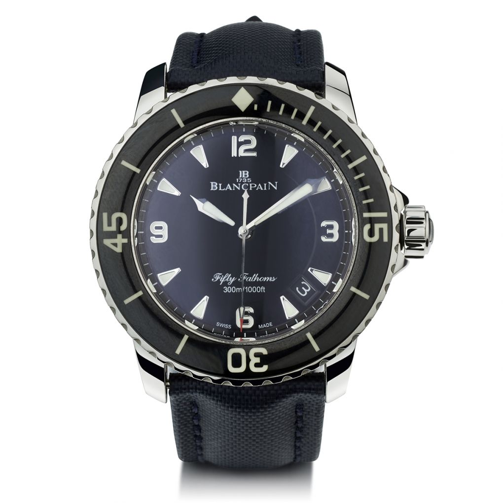 Gent's stainless steel Blancpain Fifty Fathoms wristwatch. Black dial with luminous hands and index hour markers; arabic numerals mark the 3,6,9 and 12 o'clock; date display between the 4 and 5 o'clock position. Automatic Blancpain calibre 1315 movement. Sapphire crystal. 45mm case diameter. Original blue original strap with aftermarket tang clasp. Anti-magnetic. Year 2012. Reference #: 5015113052.