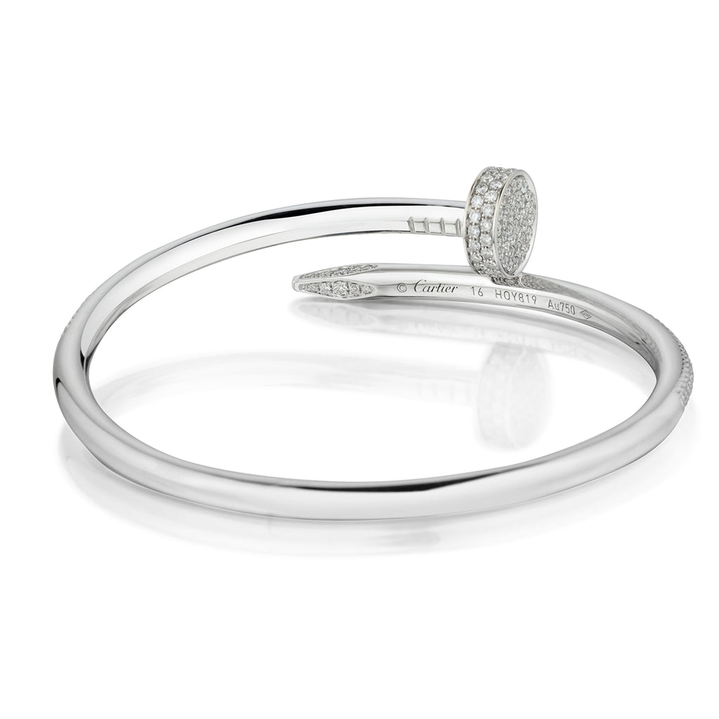 Cartier Juste un Clou classic model bracelet with diamonds. This bracelet features 374 x 2.26 total carat weight of Brilliant cut diamonds. Size:16. 3.5mm (W). Weight: 30.5 grams.Purchased: 2019