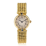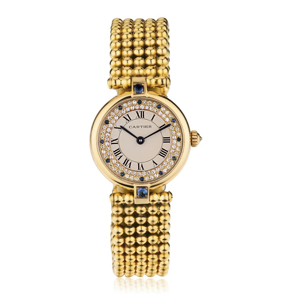 Ladies 18kt Yellow gold Cartier Colisee Limited Edition wristwatch. Integrated 18kt yellow gold boules bracelet with 18kt gold deployant buckle. Unique Silver diamond dial with Roman numerals. Set with single cut diamonds and Blue Sapphires. Blue sword hands. Crown set with diamond. 24mm case size. Quartz movement. Total weight:55 grams. Reference number: 890004.