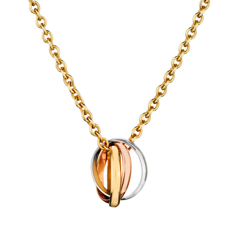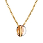 Cartier Trinity pendant on chain. Featuring 3 interlaced pink, yellow and white gold pendant. Measuring: 12.5mm in size. Attached to an 18kt yellow gold Cartier chain measuring 16" (L). Total weight: 8.31 grams.