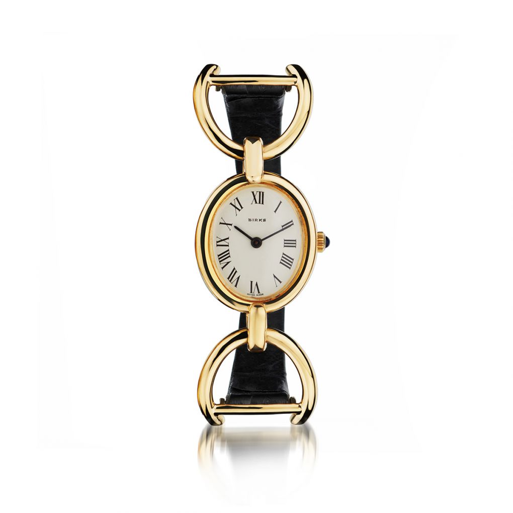 Ladies rare and unique 18kt yellow gold Chopard L.U.C oval-cased wristwatch. Ivory dial with Roman numeral hour markers; signed birks on the dial. Manual winding Chopard movement. Black leather strap with plated tang clasp. Sapphire crystal. 21mm x 22mm case diameter.Weight: 34.25 grams. Circa 1970's.