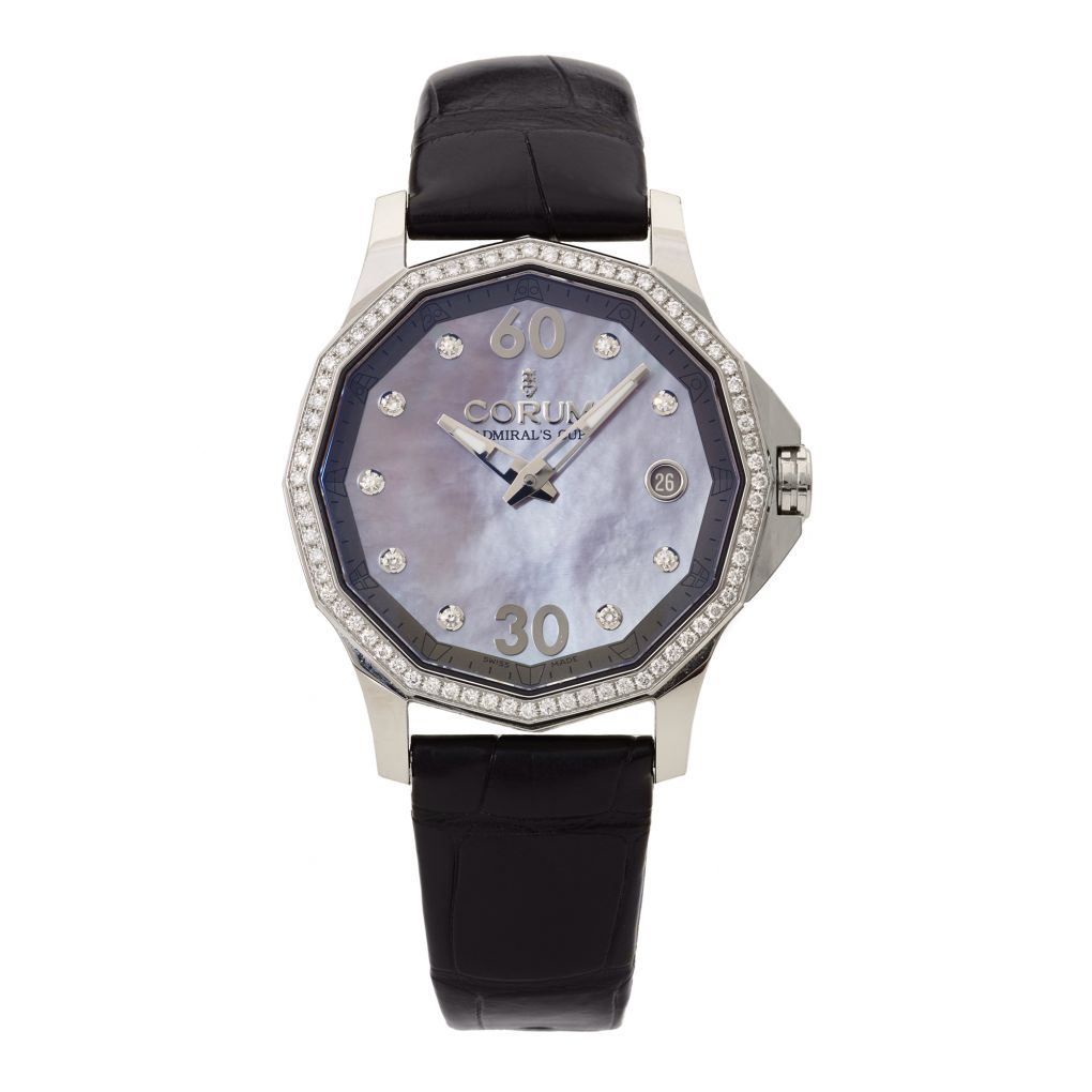 Ladies stainless steel Corum Admiral's Cup Legend wristwatch featured on a black leather strap with a Corum buckle. 38mm case diameter. Grey Mother of Pearl dial with diamond hour markers; date aperture at the 3 o'clock position. Automatic movement. Sapphire crystal. Transparent case-back. Reference #: 082.101.47, F149PK11.