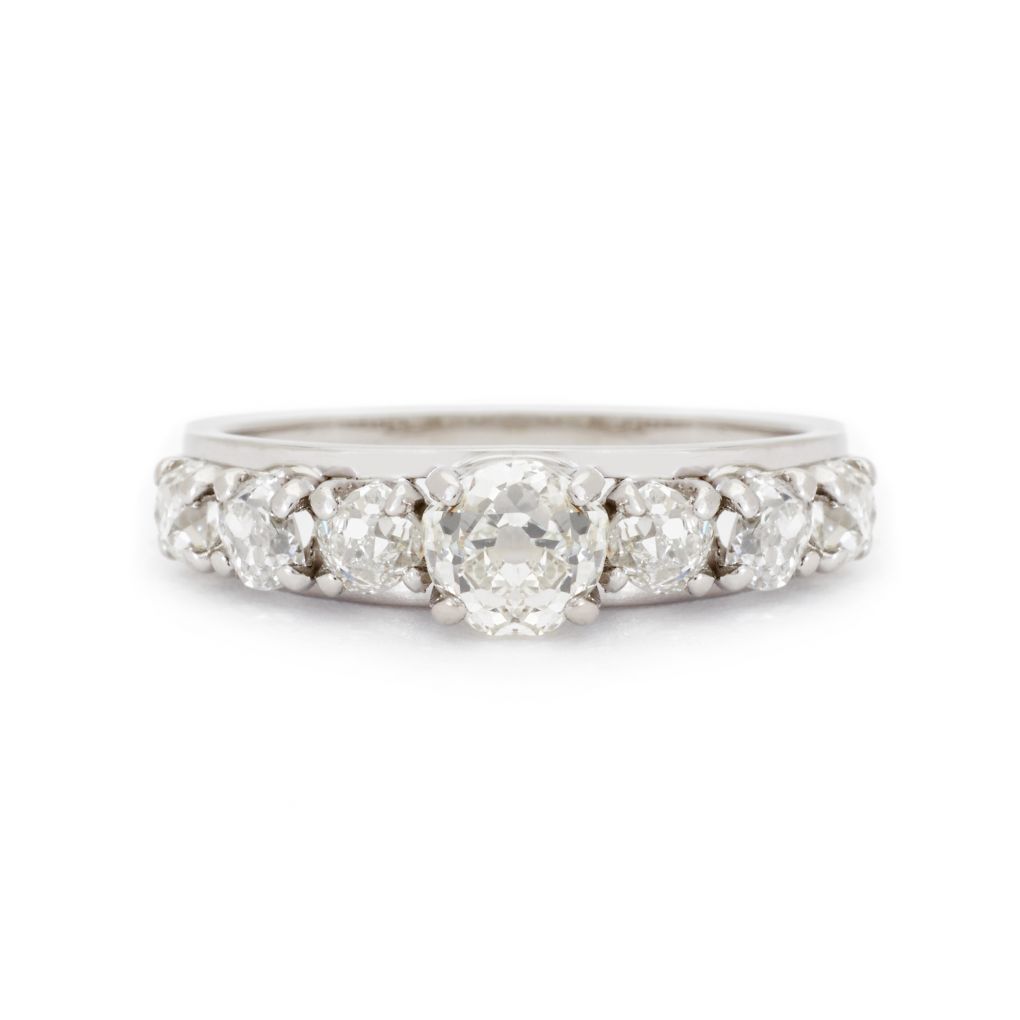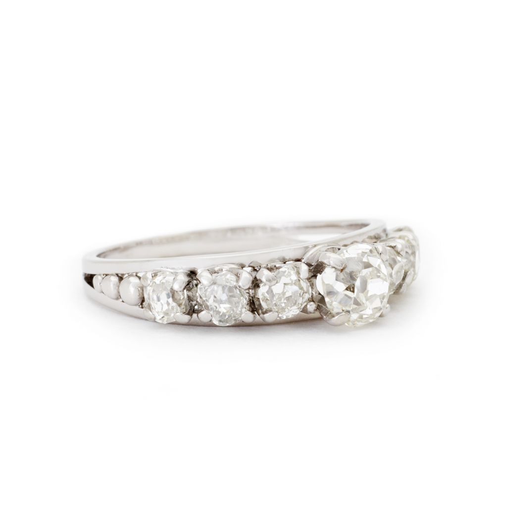Ladies Edwardian-era platinum and diamond ring containing 7 old-mine cut diamonds weighing approximately 1.00 carat total weight of (VS-SI) in clarity and (H-J) in colour. Circa 1905 (+/-).
