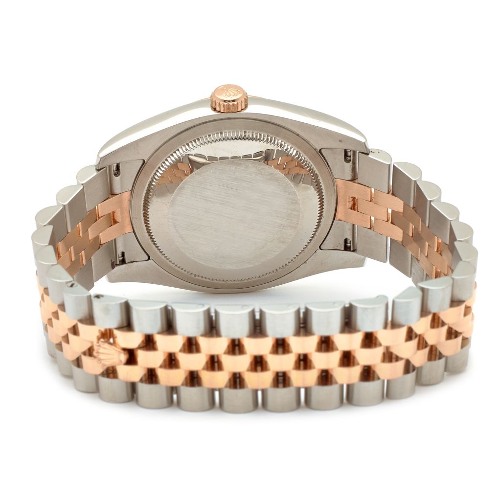 Gent's stainless steel and 18kt everose gold Rolex Oyster Perpetual Datejust wristwatch. Integrated stainless steel and yellow gold Jubilee bracelet. 18kt yellow gold fluted bezel. 36mm case diameter. Grey dial with diamond hour markers; date aperture at the three o'clock position. Sapphire crystal. Automatic movement. Solid case-back. Circa 2008. Reference #: 116233.