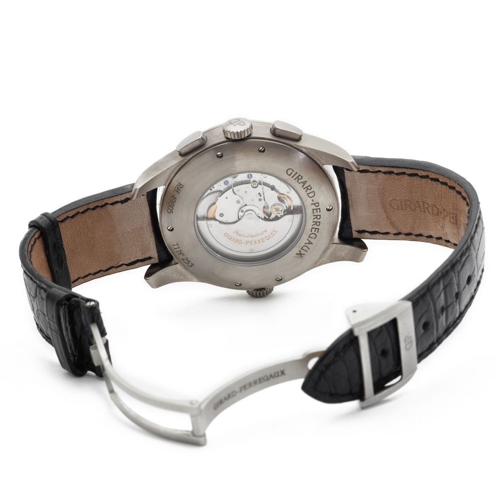 Gent’s titanium Girard-Perregaux World Time Traveller wristwatch featured on an original black croco strap with deployant clasp. 43mm case diameter; 13.4mm case thickness. Black dial; functions: Hours, Minutes, Seconds, Date, Power Reserve, Chronograph, World Time, Day & Night indicator. Mechanical, Automatic winding. Fixed Bezel. Reference #: 49805.