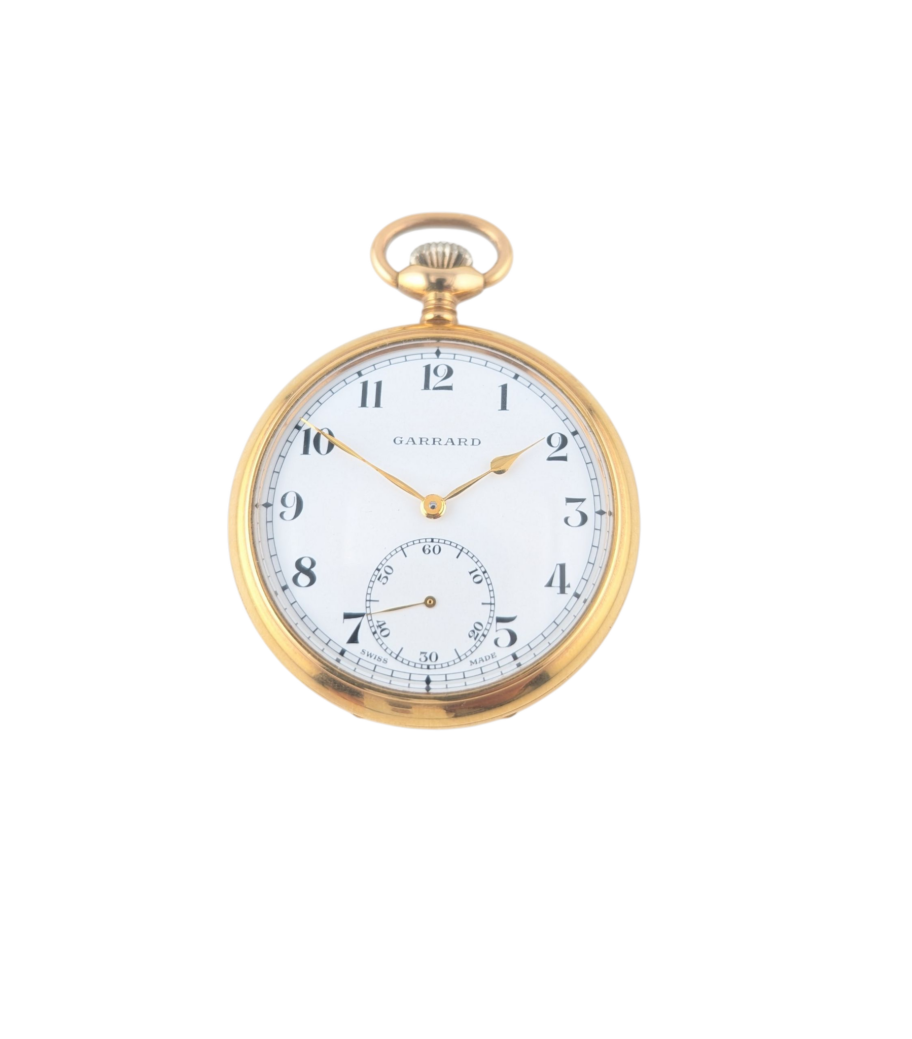 Garrard pocket watch. 20 Micron gold filled. Featuring a white dial and Arabic style hour markers. Sweep seconds hand. Manual winding. Swiss made. Measuring 50 mm