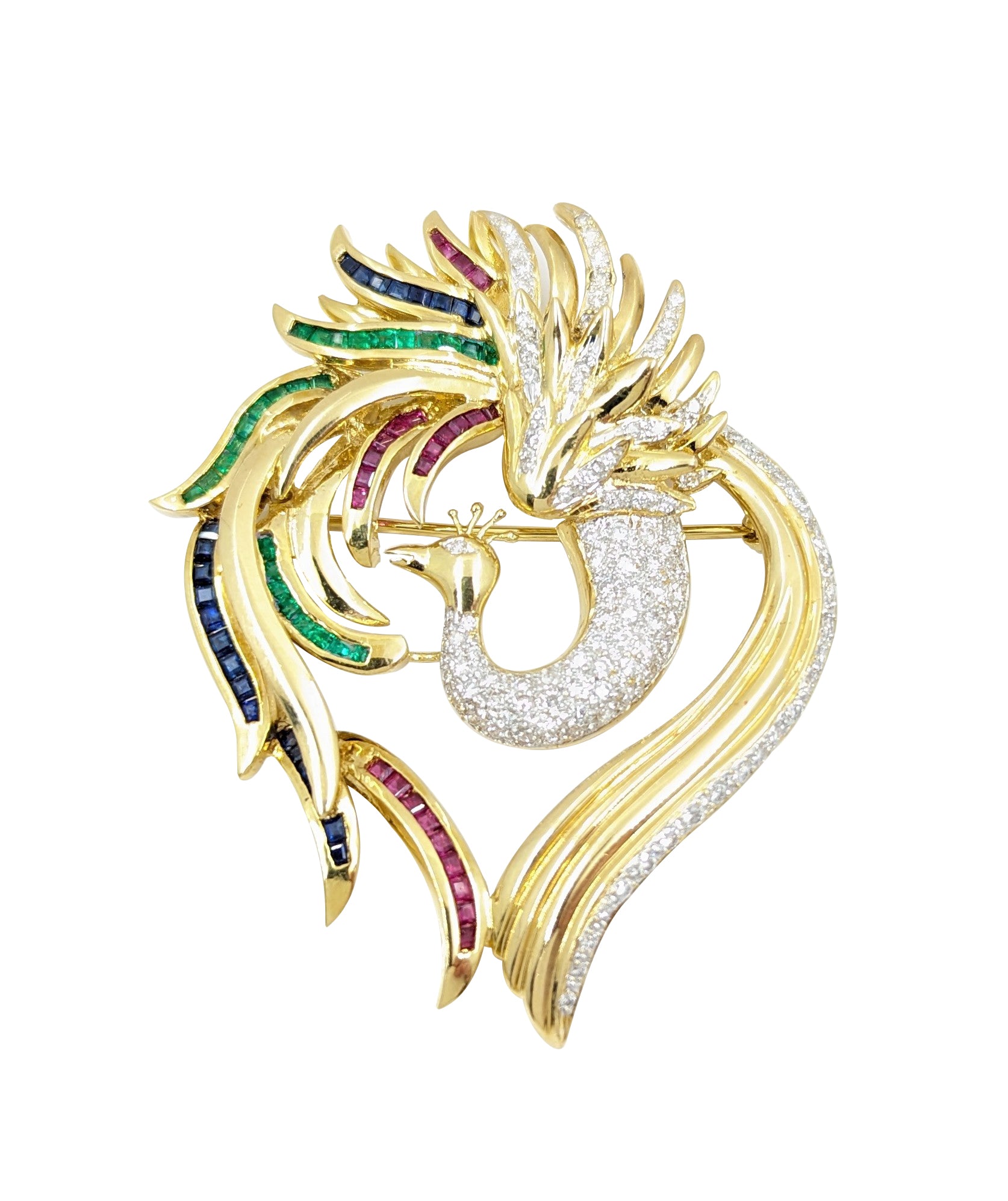 Gorgeous 18kt Diamond and Precious Gem Stone Peacock Brooch