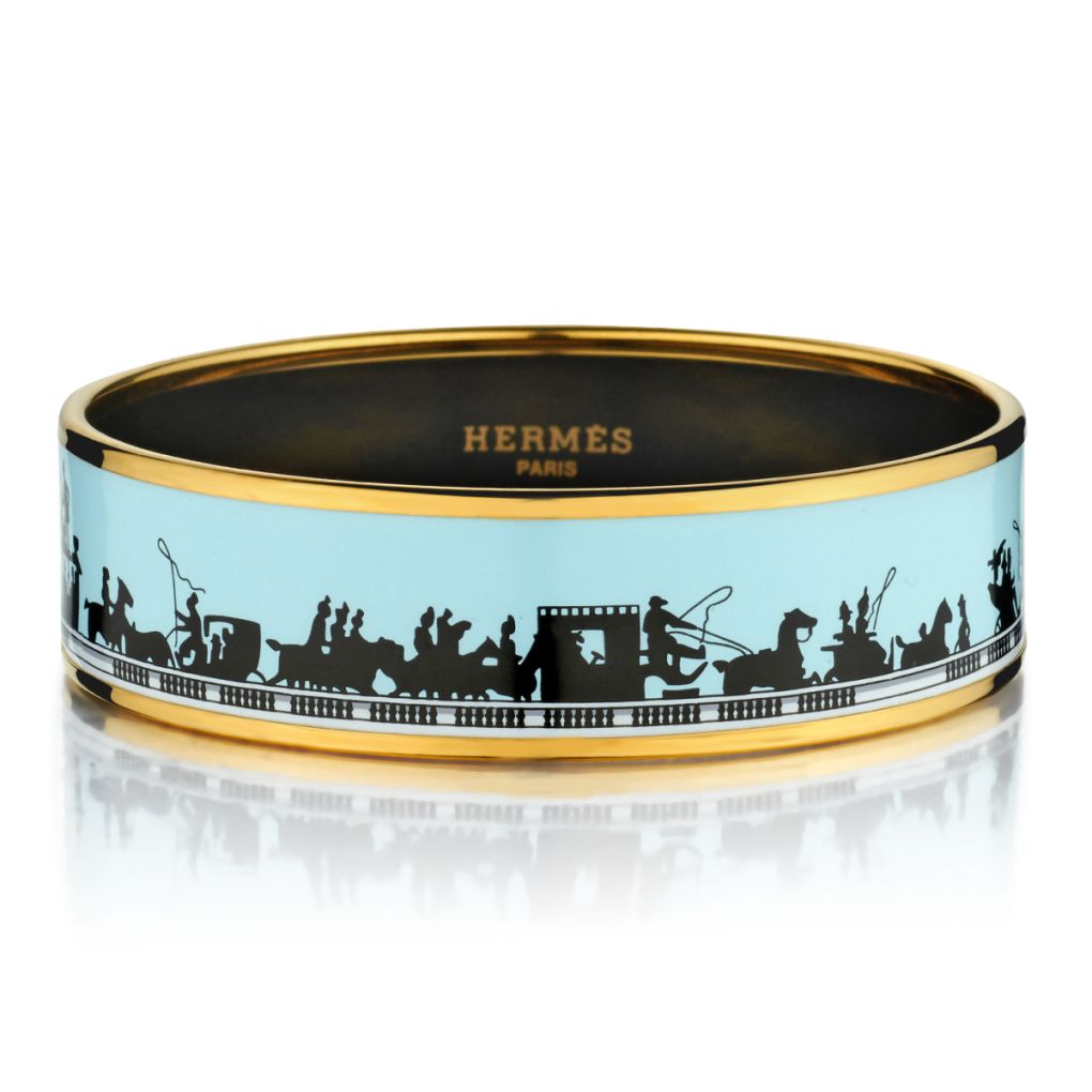 Hermes printed enamel bangle featuring an illustration of horses and carriages. Turquoise background. Yellow gold plated. To fit wrist size 8 inch. Circa 2007. Made in Austria.