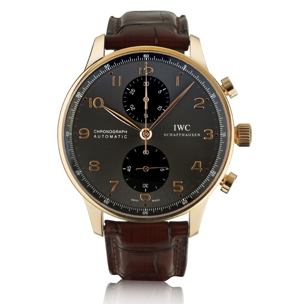 Gent's 18kt rose gold IWC Portuguese Chronograph automatic wristwatch featured on an IWC brown leather strap. Grey dial with gold-tone hands and Arabic numeral hour markers; minute markers around outer rim; chronograph: two sub-dials displaying 60 second and 30 minute. Sapphire crystal. 40.9mm case diameter. 12.3mm case thickness. Automatic movement, calibre 79350. Year 2016. Reference #: IW371482.
