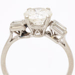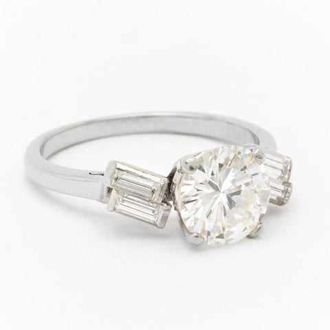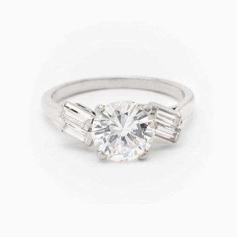 A beautiful Ladies Platinum ring featuring a 1.50 carat Round Brilliant-cut diamond of (SI-2) in clarity and (F) in color. The center stone is accented with (4) Baguette diamonds in total weighing approximately 0.18 total carat weight.