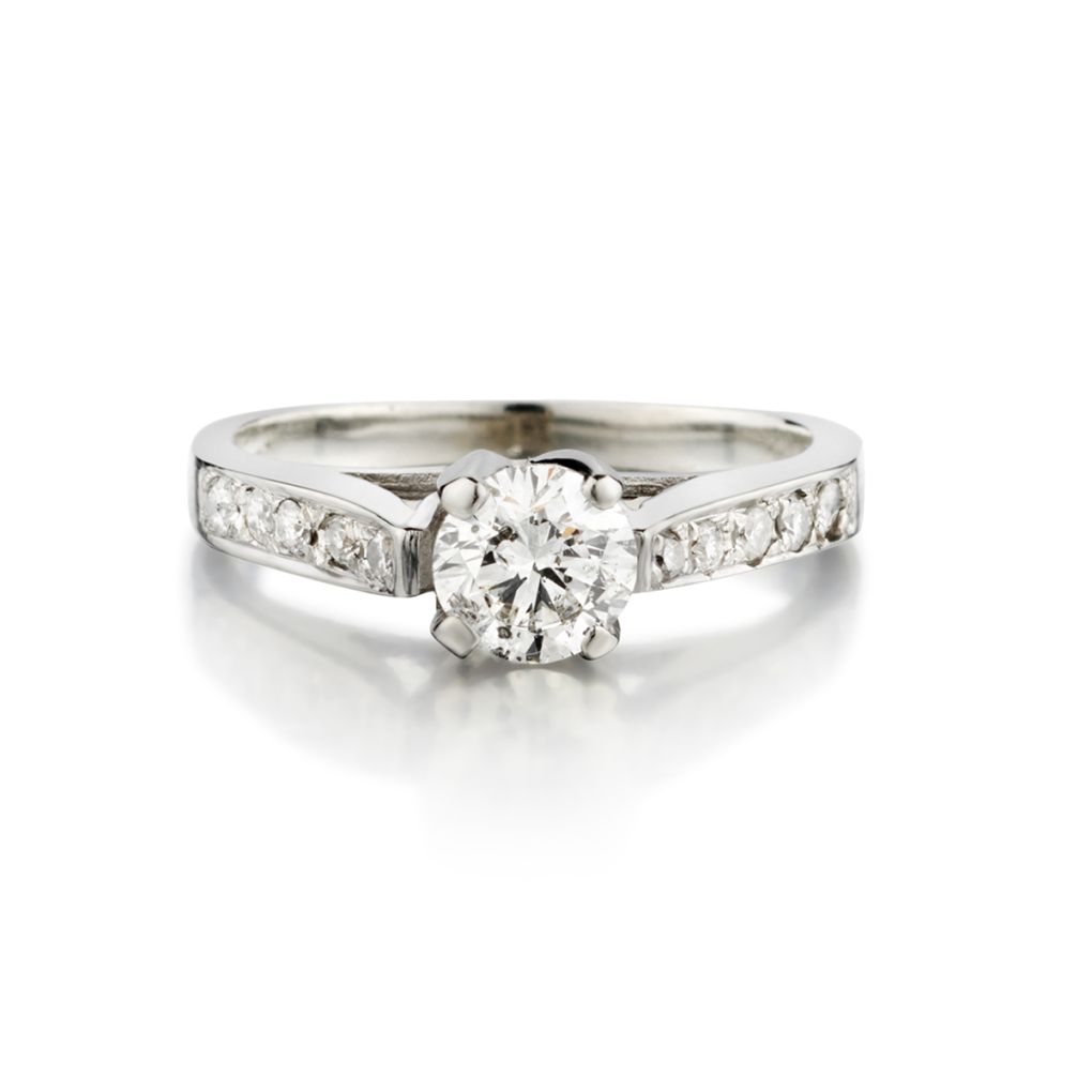Ladies 14kt white gold diamond ring featuring a Brilliant cut diamond weighing 0.71 carat weight of (G) in color and (I-1) in clarity. Also featuring 0.20 total carat weight of brilliant cut diamonds. Current finger size 5-1/2. This ring can be resized.