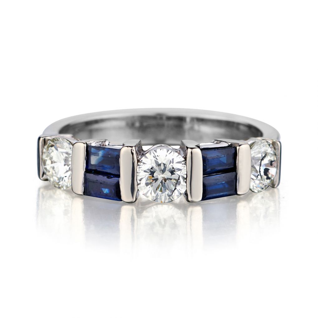 Ladies 14kt white gold diamond and Blue Sapphire band featuring 3 x 0.50ct total carat weight of Brilliant cut diamonds (SI) in clarity and (K) in colour. 4 Baguette cut Blue Sapphires weighing 0.40ct total carat weight.Size 5. This ring can be resized.