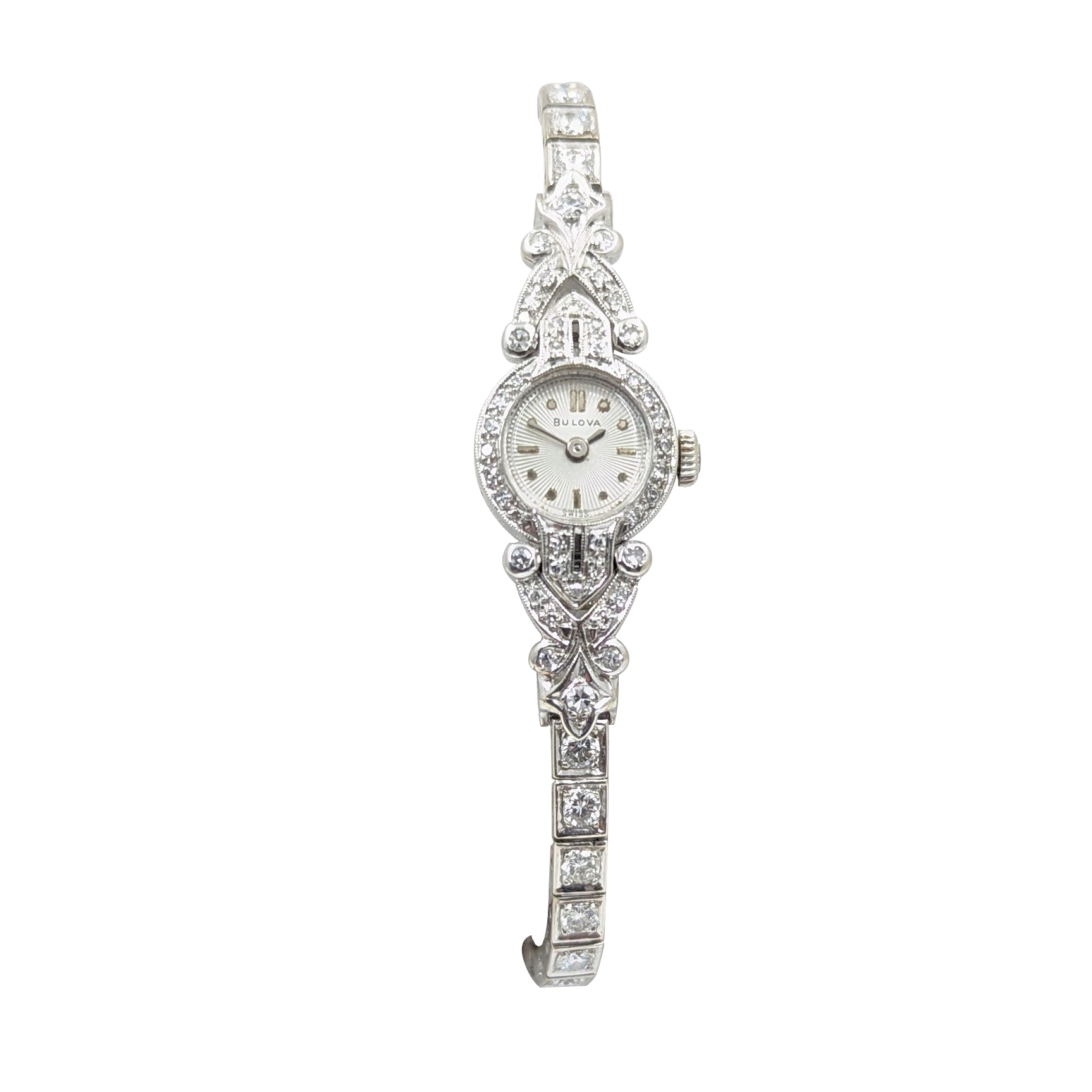 Ladies 14kt white gold diamond dress watch with an integrated  bracelet. This watch is set with 2.50 total carat weight of Brilliant cut diamonds. Brand: Bulova. Case size: 15mm. Manual movement. To fit wrist size:6-1/4"