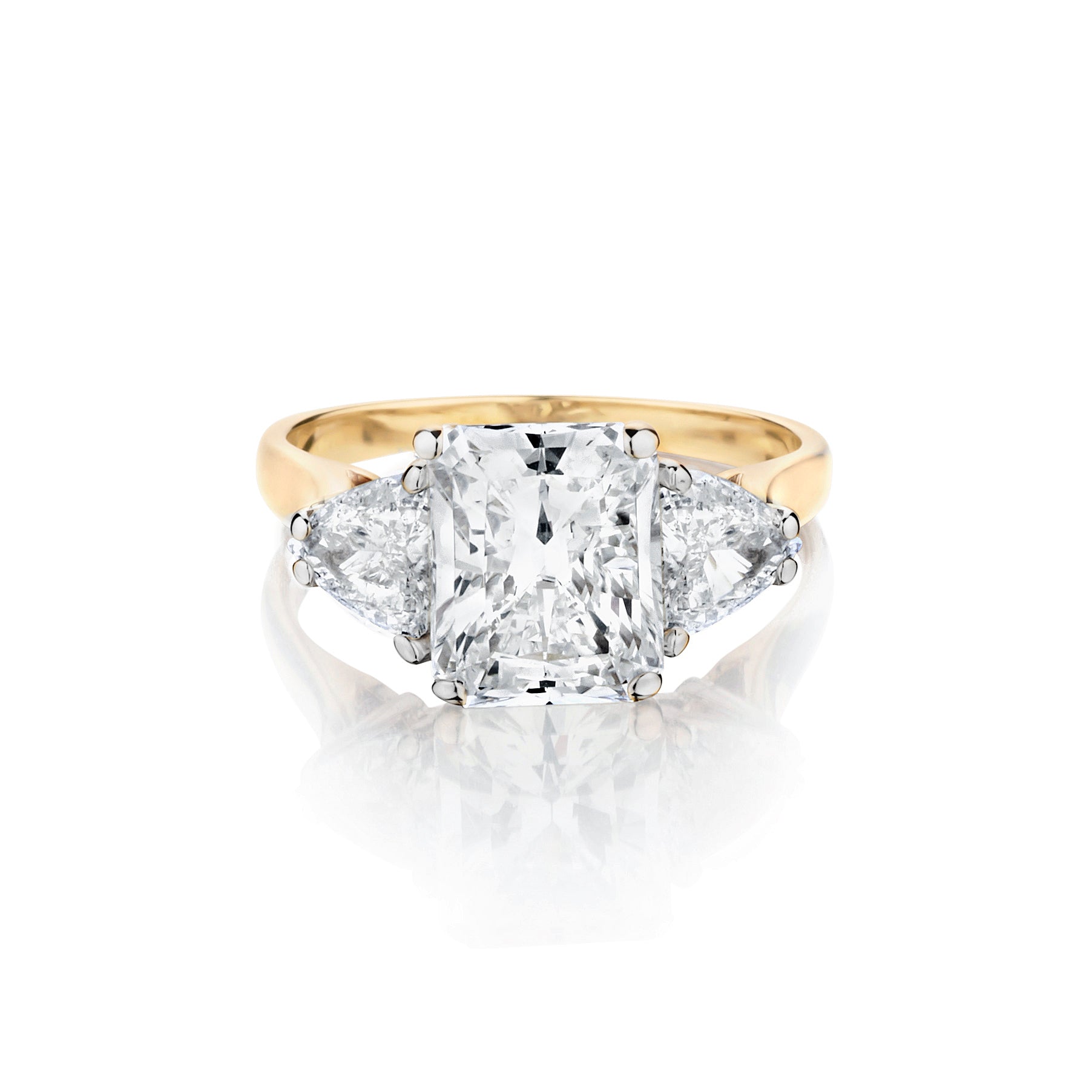 Ladies 14kt yellow gold diamond ring. This ring features a beautiful Radiant cut diamond weighing 2.75 carat weight of (VS-1) in clarity and (H) in colour. Good cut. Two triangular (trillian) diamonds weighing 0.80 total carat weight of (SI-1) in clarity and (I) in colour. Good Cut. Weight: 3.92 grams. Current finger size: 6-1/2. This ring can be resized.