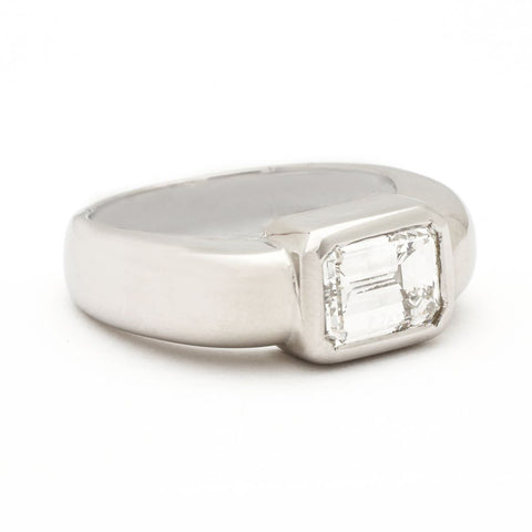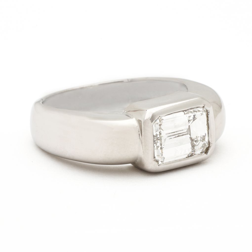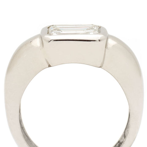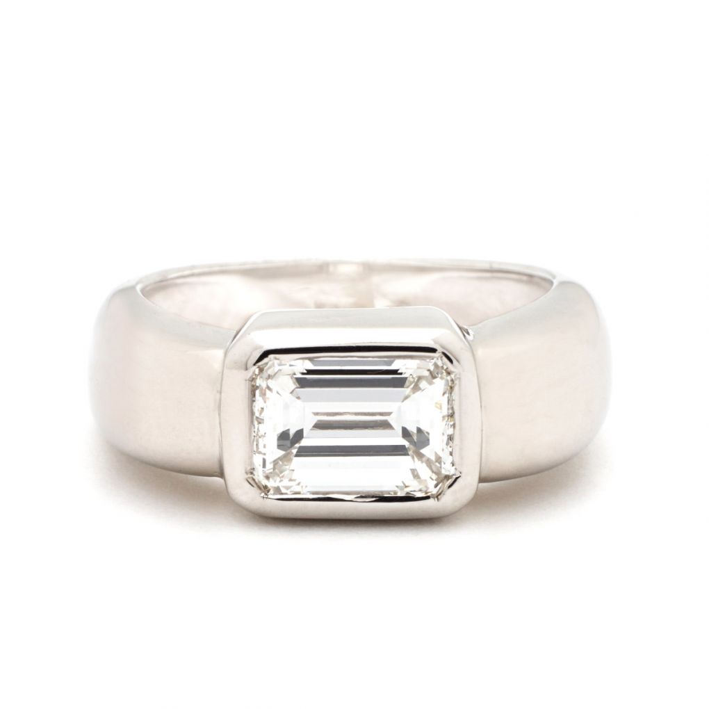 Ladies 18kt white gold chunky diamond solitaire ring featuring a horizontally bezel-set 2.00 carat Emerald Cut diamond of (SI-1) in clarity and (G) in color.