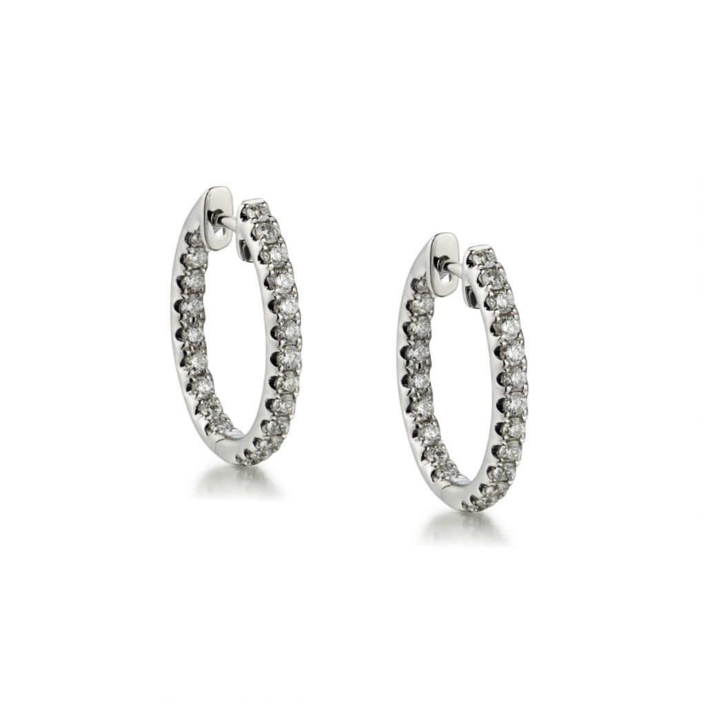Ladies 18kt white gold diamond hoop earings featuring 1.00 total carat weight of Brilliant cut diamonds of (SI) in clarity and (G-H) in colour. Diamonds are front and back. Measuring 20mm (L) x 2.5mm (W).