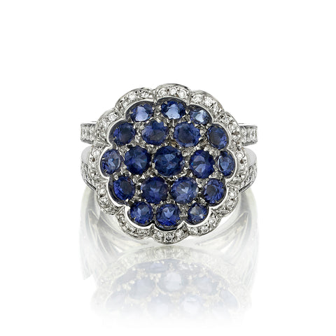 Ladies 18kt white gold Tanzanite and diamond cluster ring. This ring features a concave floral design. Ring size: 7. This ring can be resized. Measuring: 21mm round. Weight: 14.72 grams. Current finger size: 7. This ring can be resized.