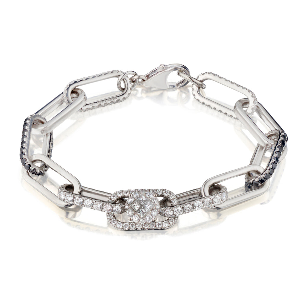 Ladies 18kt white gold open paper clip link and diamond bracelet. This bracelet features white and black diamonds weighing 6.00 total carat. Lobster clasp closure. Measuring: 6-1/2" (L). Weight: 19.4 grams.