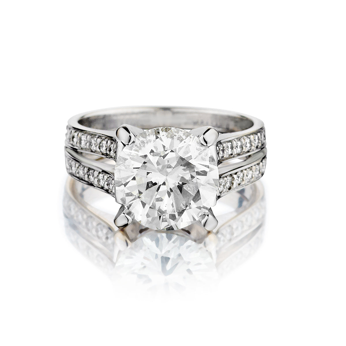 Ladies 18kt white gold diamond ring featuring a Brilliant cut diamond weighing 2.76 carat weight of (I-1) in clarity and (F-G) in colour. This beautiful diamond is set in a solitaire setting with a split shank featuring 36 x 0.45 total carat weight of Brilliant cut diamonds. Current finger size: 5-1/2. This ring can be resized.