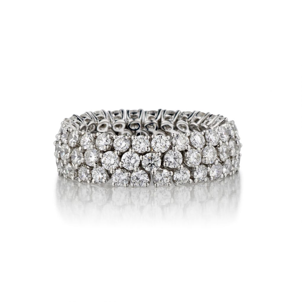Ladies 18kt white gold diamond flexible mesh eternity band featuring 78 x 3.15 total carat weight of Brilliant cut diamonds of (VS-SI) in clarity and (G-H) in colour. Three rows. 6mm (W). Current finger size 7. This ring cannot be resized.