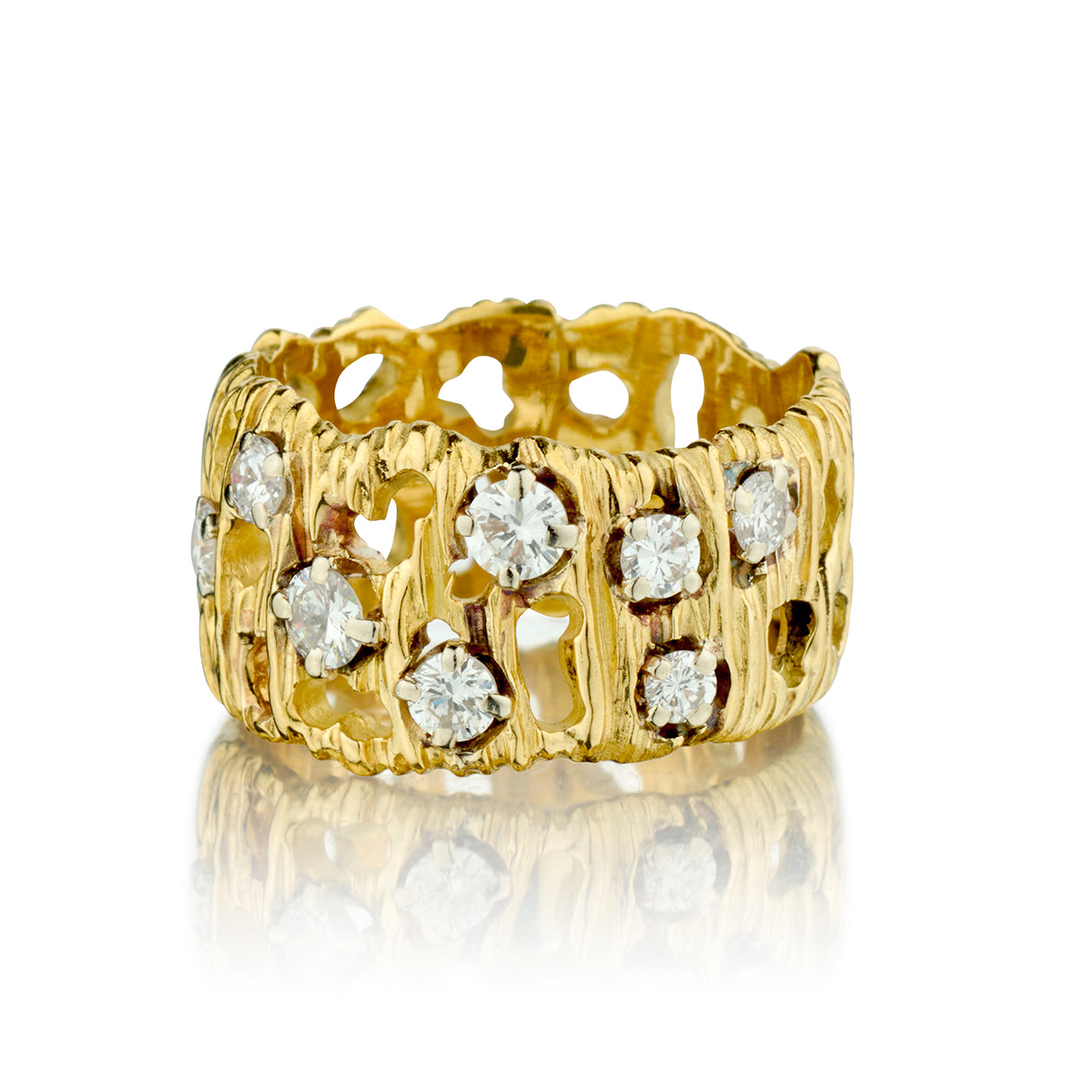Ladies handmade 18kt yellow gold diamond band. This ring features 8 x 0.50 total carat weight of Brilliant cut diamonds. Measuring:11mm (W). Current finger size: 5. This ring can be resized. Weight: 8 grams