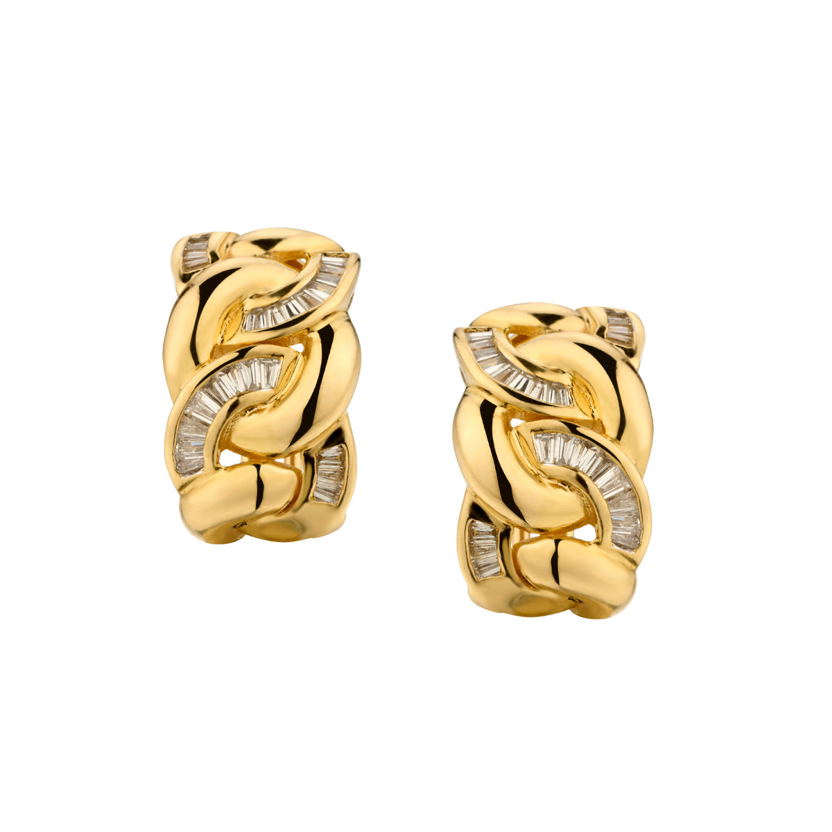 Ladies 18kt yellow gold braided hoop earrings featuring 48 x 1.00 total carat weight of Baguette cut diamonds  of (VS) in clarity and (G) in colour. Measuring: 19mm (L) x 12mm (W) Weight: 12.16 grams.