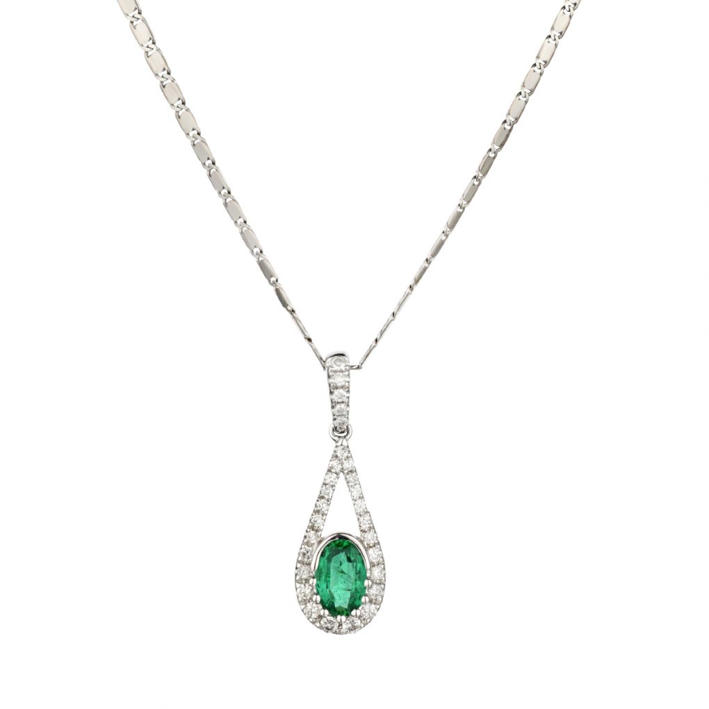 Ladies 14kt white gold Green Emerald and Diamond pendant . This pendant features an Oval cut Green emerald weighing 0.50 carat weight. This stone is surrounded by a halo of Brilliant cut diamonds weighing 0.20 carat weight. Pendant measure 21mm (L).18kt white gold chain measuring 16' in length.