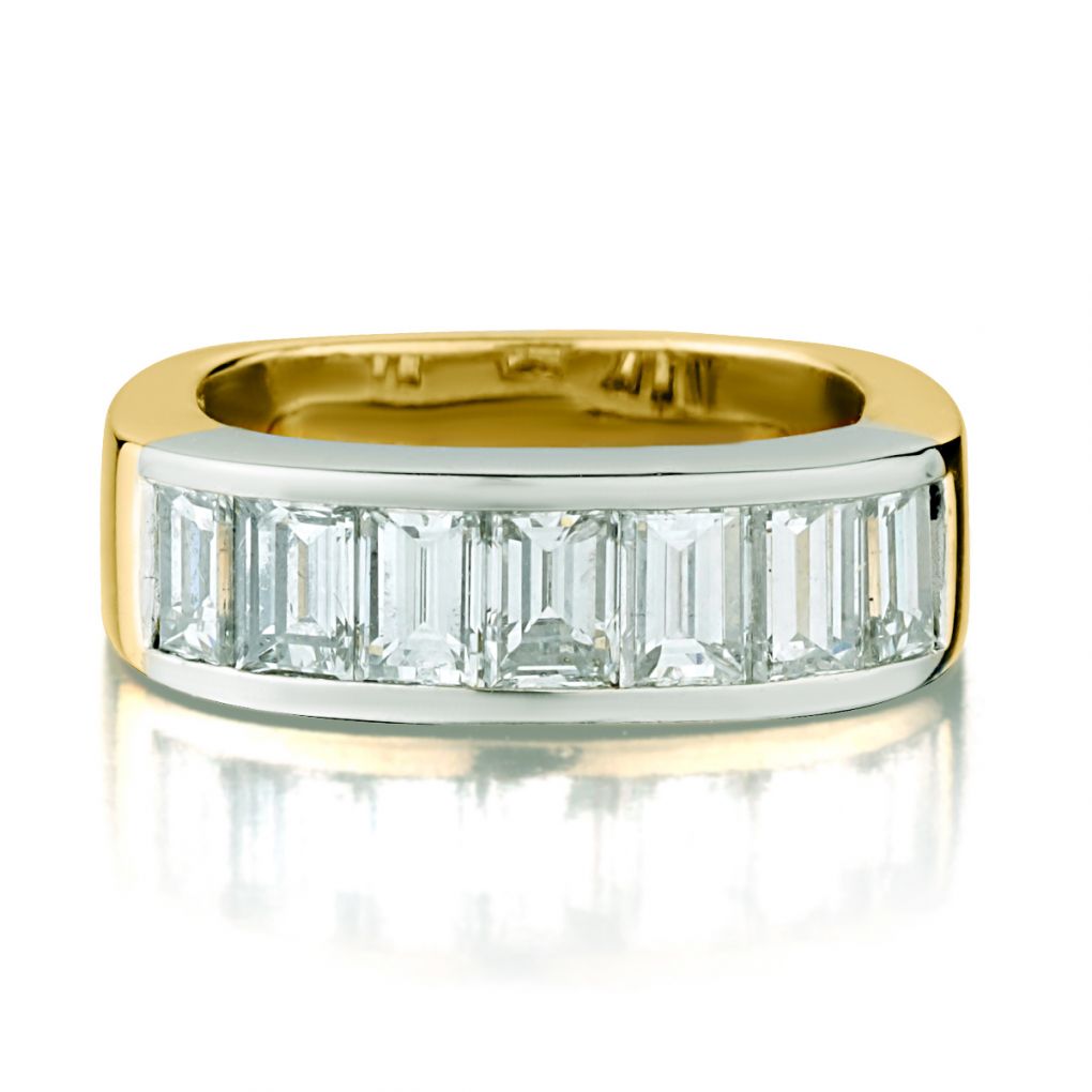 Platinum and 18kt yellow gold Diamond band featuring 7 x 2.50 total carat weight of Baguette cut diamonds of (VS) in clarity and (G) in colour. Hand made.Squared mounting .6mm wide. Finger size 6. This ring can be resized. Weight is 10 grams.