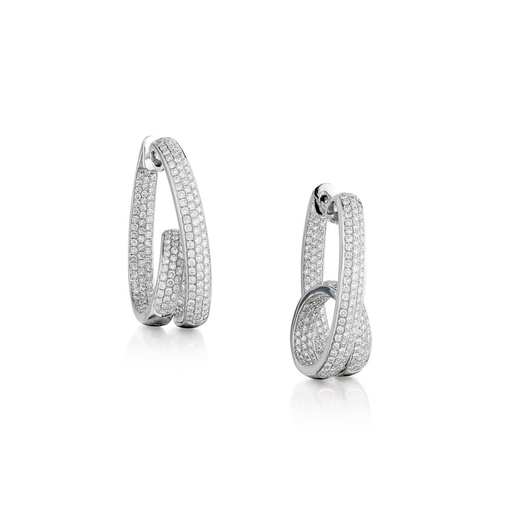 • Ladies diamond swirl hoop earings. 2.50ct Tw Brilliant cut diamonds