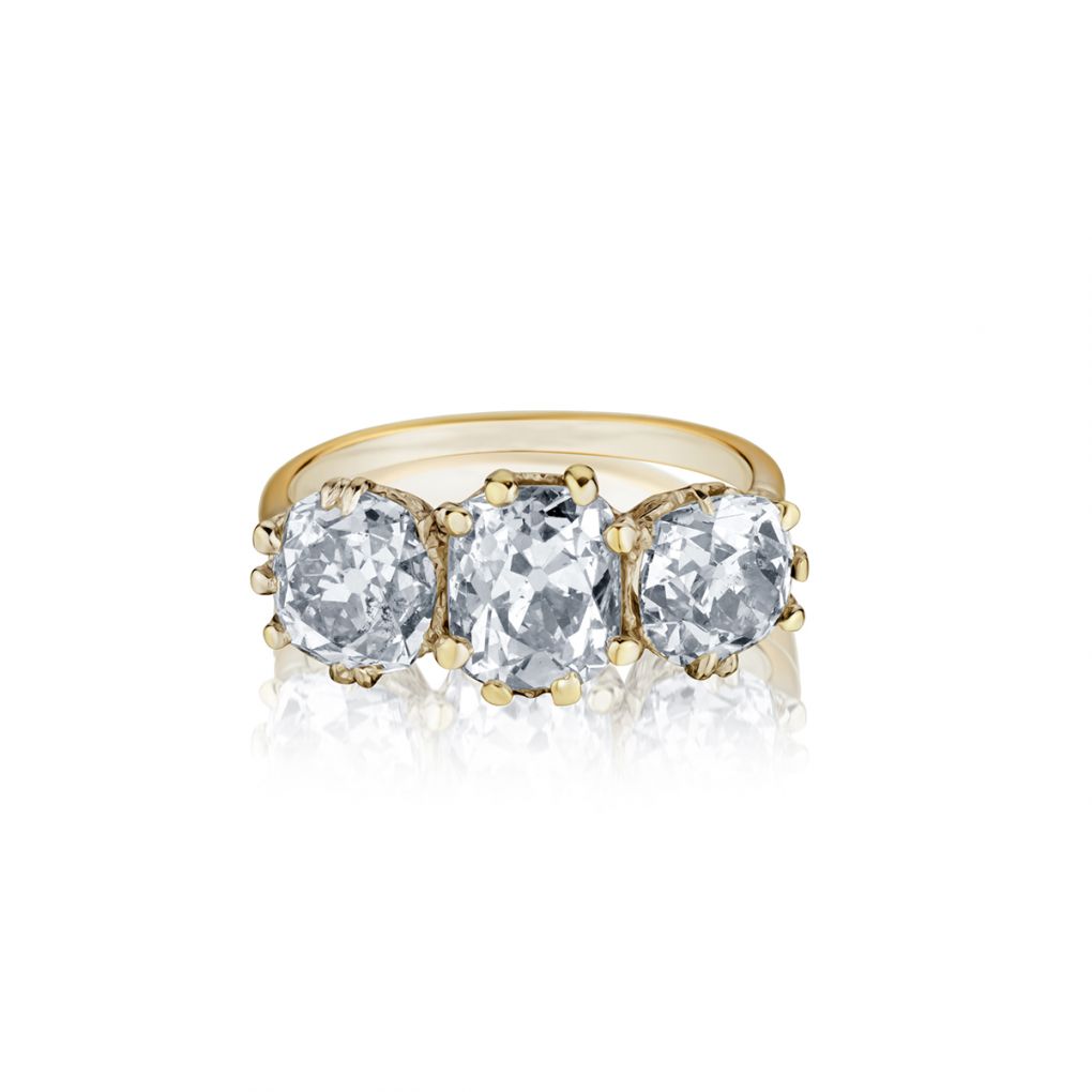 • Ladies Platinum Vintage 3 Stone Diamond Ring. 5.40 Ctw Cushion Cut Diamonds