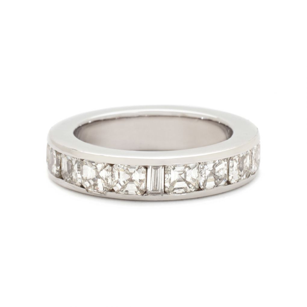 Ladies beautiful 18kt white gold diamond eternity bands featuring (1) baguette-cut and (18) Asscher-cut channel-set diamonds around the entire band weighing approximately 5.00 carat total weight of (VS) in clarity and (J-K) in color. Finger size 6.