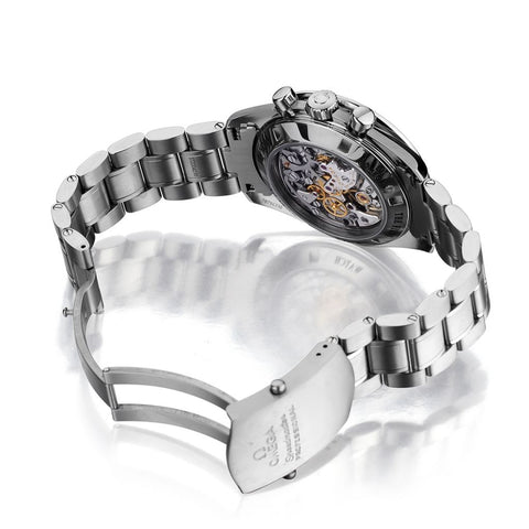 Omega Speedmaster Moon watch Professional in steel . Integrated stainless steel band. Master chronometer. 42mm case size. Manual winding. Calibre:3861. Water resistant:50 metres. 18 Jewels. Anti magnetic. Skeleton glass back.